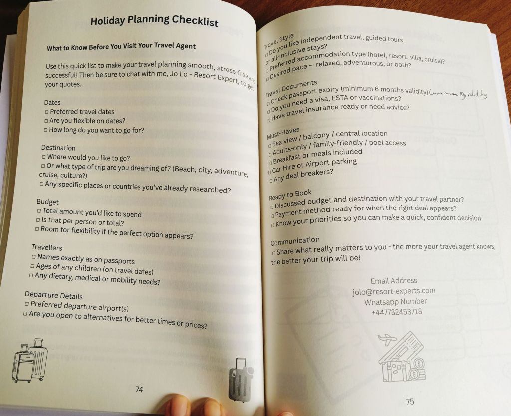 I had another call with a potential customer in the afternoon and I used a page from The Handy Travel Planner when they asked me what information I needed to know to find them a suitable holiday for the family.