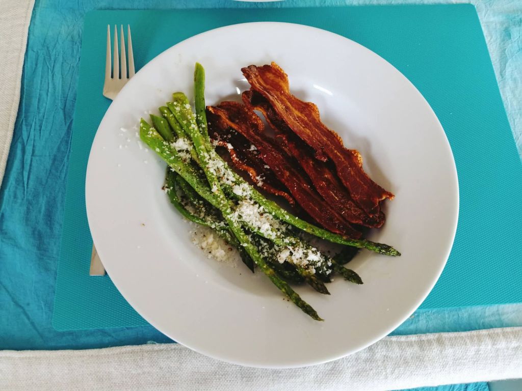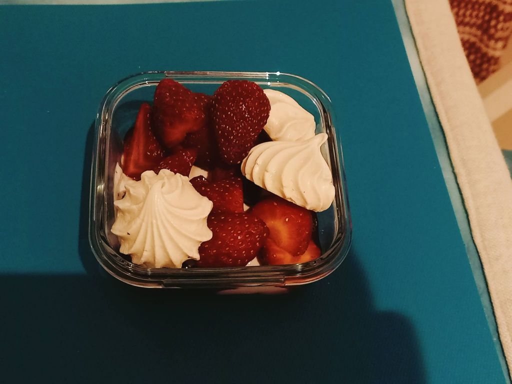 I had bacon and asparagus for dinner, with parmesan on. It was so good and rather extravagant. For afters I made strawberries with quark and mini meringues.
