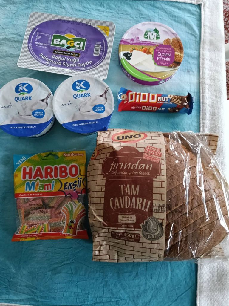 At Fat Club I was very disappointed to find I had put on a whopping 1.8kg (4lb)! I bought a water for 30 lira (51p) because I’d already overdone it on the Turkish tea this morning. I was out of Quark so I nipped to the shop after the group, here’s what I bought with prices in lira;