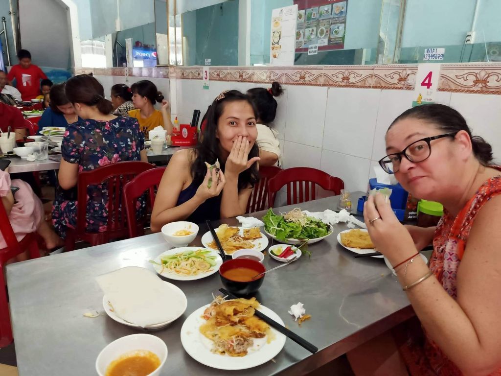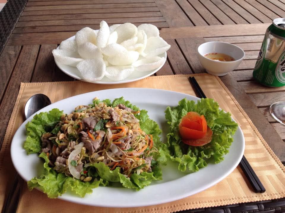 This dish is a real treat and one I like to eat as part of a social gathering as it involves using your hands and even helping others roll them. You are usually served the crispy pancakes containing some or all of pork, shrimp, bean sprouts, quails egg along with a plate of green salad, strips of pickled carrot and cucumber and some rice paper to roll it all in before dipping in the crushed peanut and chili sauce. It’s cheap and easy to keep ordering more to share. These can be served vegetarian too.