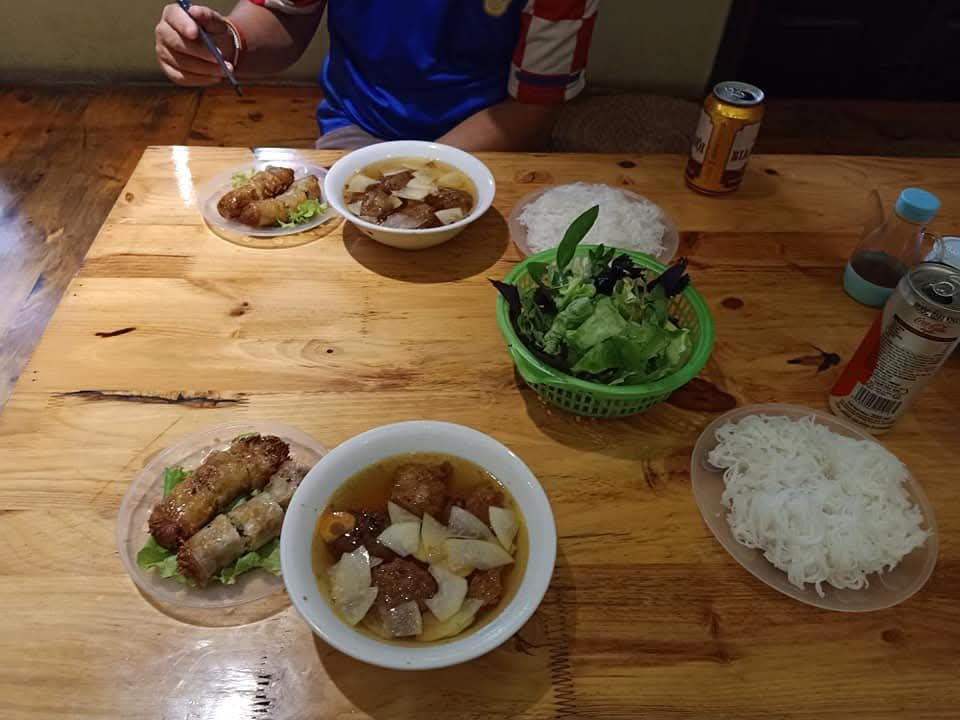 This is one of my frequent breakfast dishes, in Phong Nha. It’s made differently depending on the family and which vegetables and herbs are available in their garden. It is made from rice noodles (vermicelli) that are thin and soft with slices of pork, pepper and chillies. Usually you will be served some salad to add and even a spring roll to dip in. The soup is clear and a slightly salty, oily taste to it. I never manage to eat a full bowl as it is so filling.