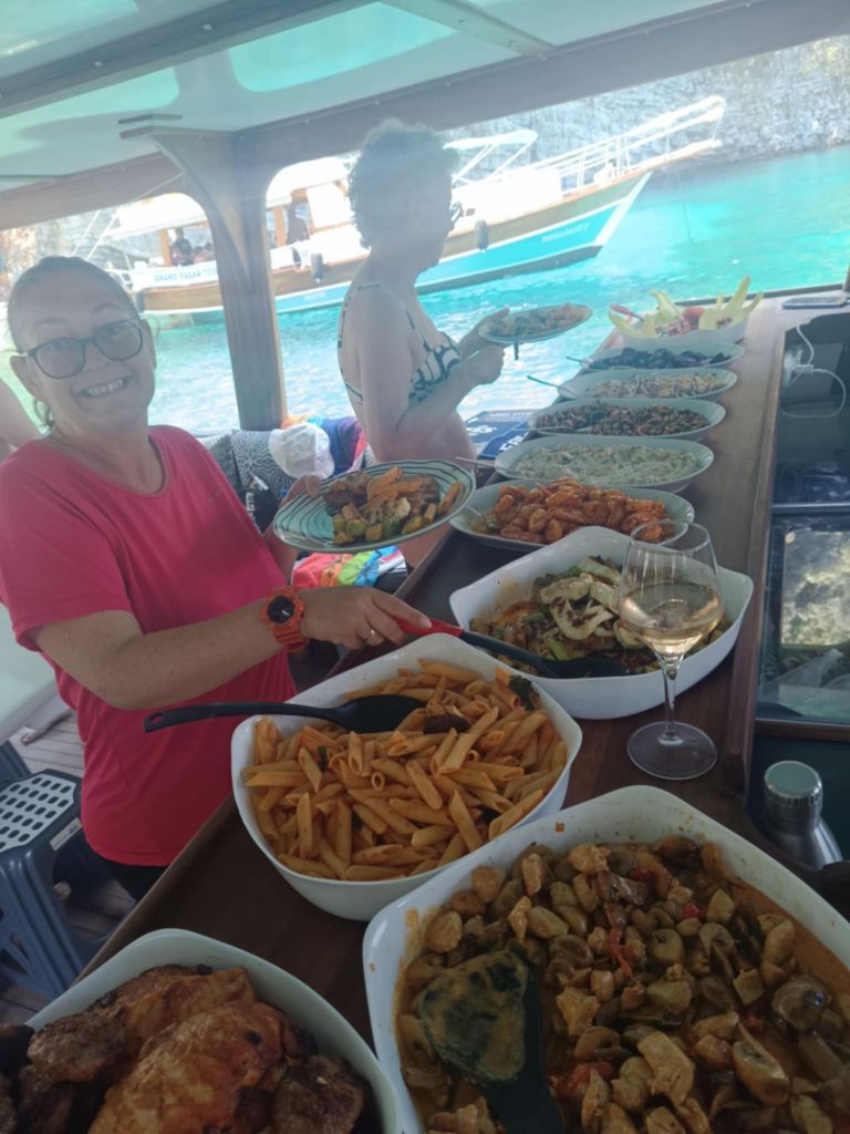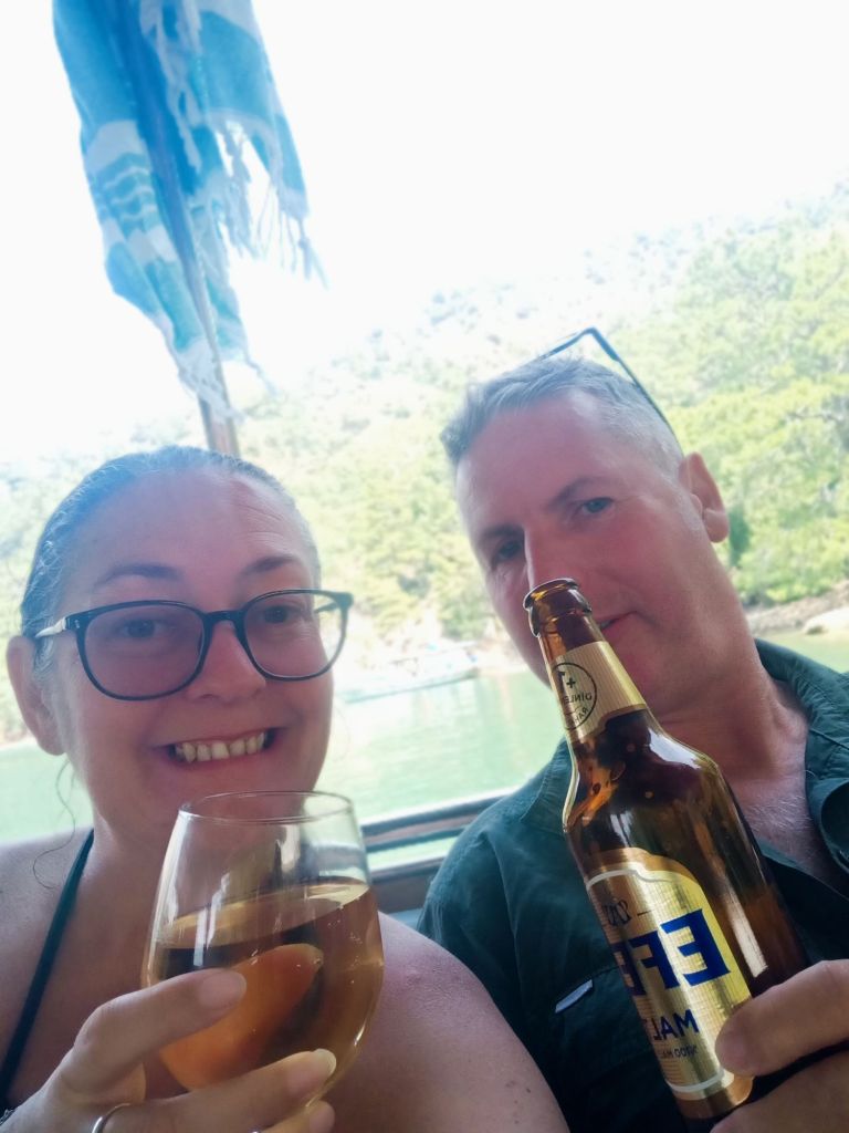 I was the first out of us all for breakfast and decided to try the hot sausages, mushrooms, beans and chips. They were of European style and quite tasty but the croissants were good and the tea strong. Compared to the Selectum Luxury Resort hotel, the Kremlin Palace was much more of a free for all dining experience. Jamie and Amanda didn’t make it to breakfast so we arranged to meet up after packing. When I got back to the room, Jamie had packed but was in and out of the bathroom being unwell and I hoped it didn’t mean we had to stay another night! The Anex Fam trip and extra night had almost broken me and my broken foot! Today was my parents’ wedding anniversary and I needed to be back in Dalyan as I’d been invited to help them celebrate with a meal out that I didn’t want to miss.