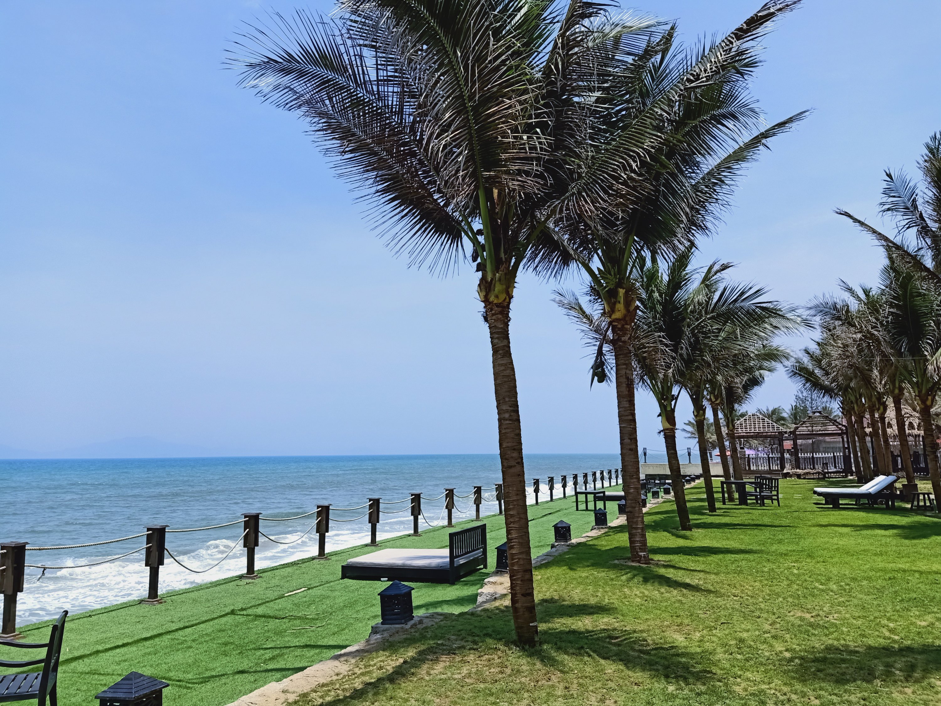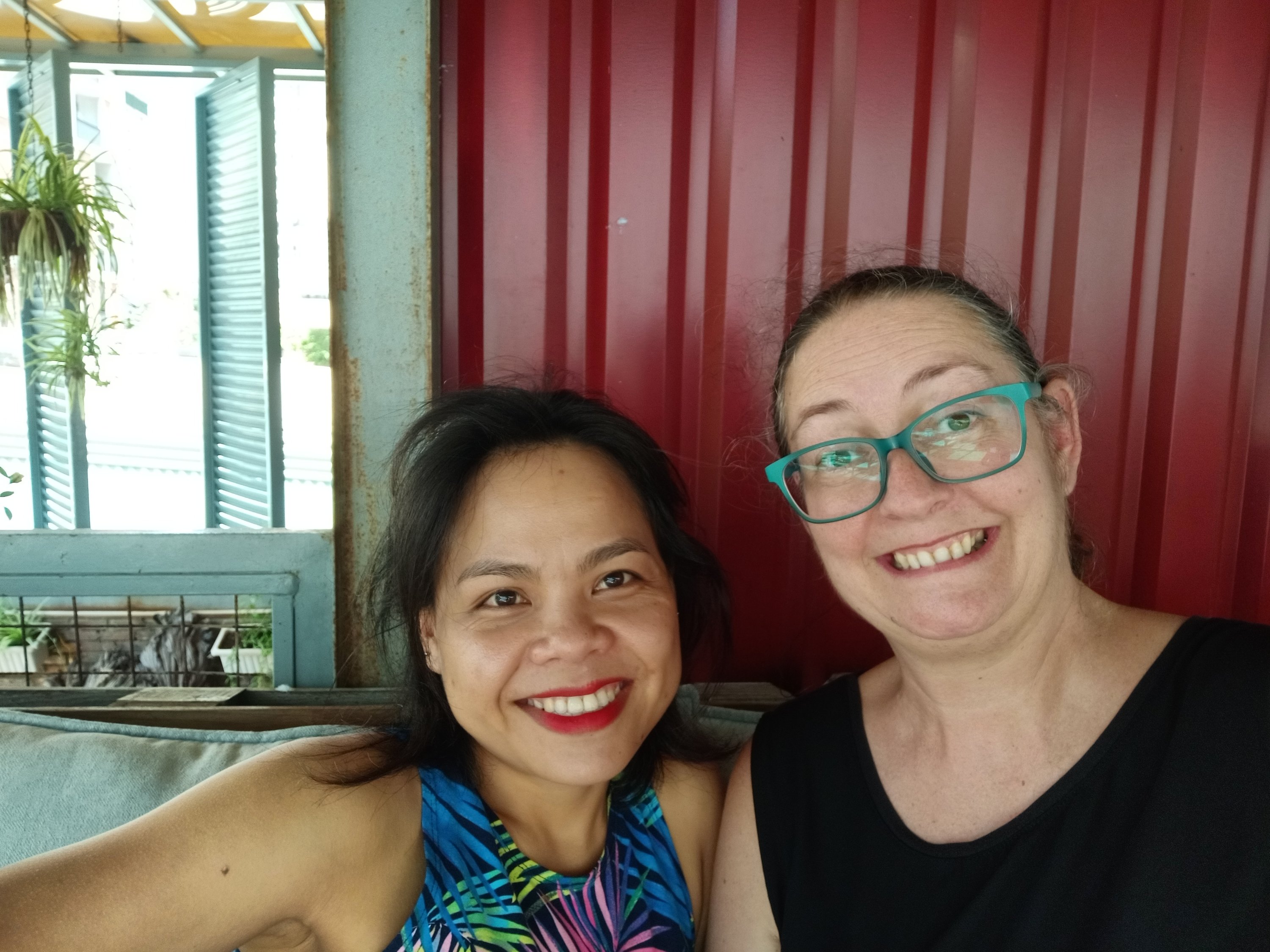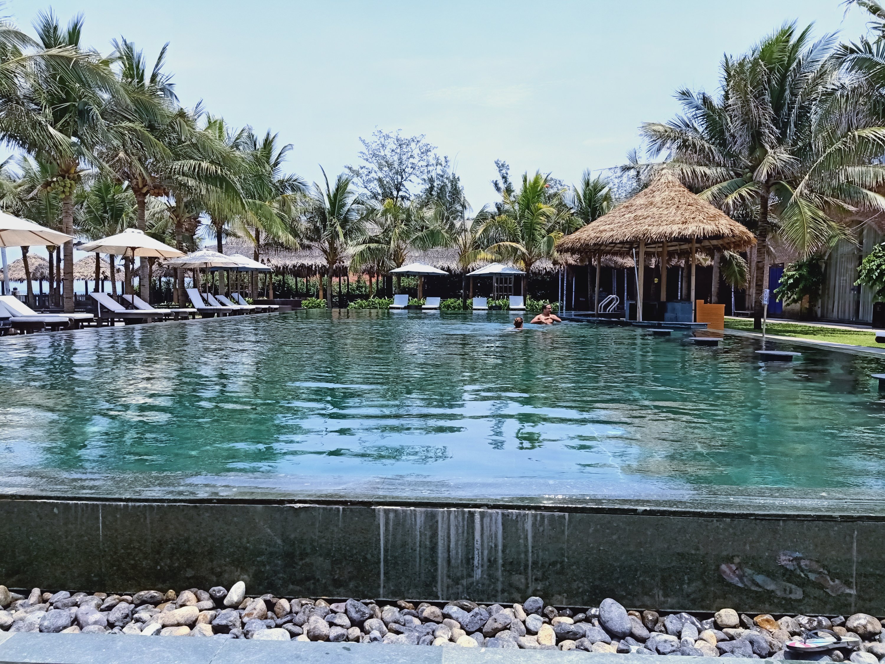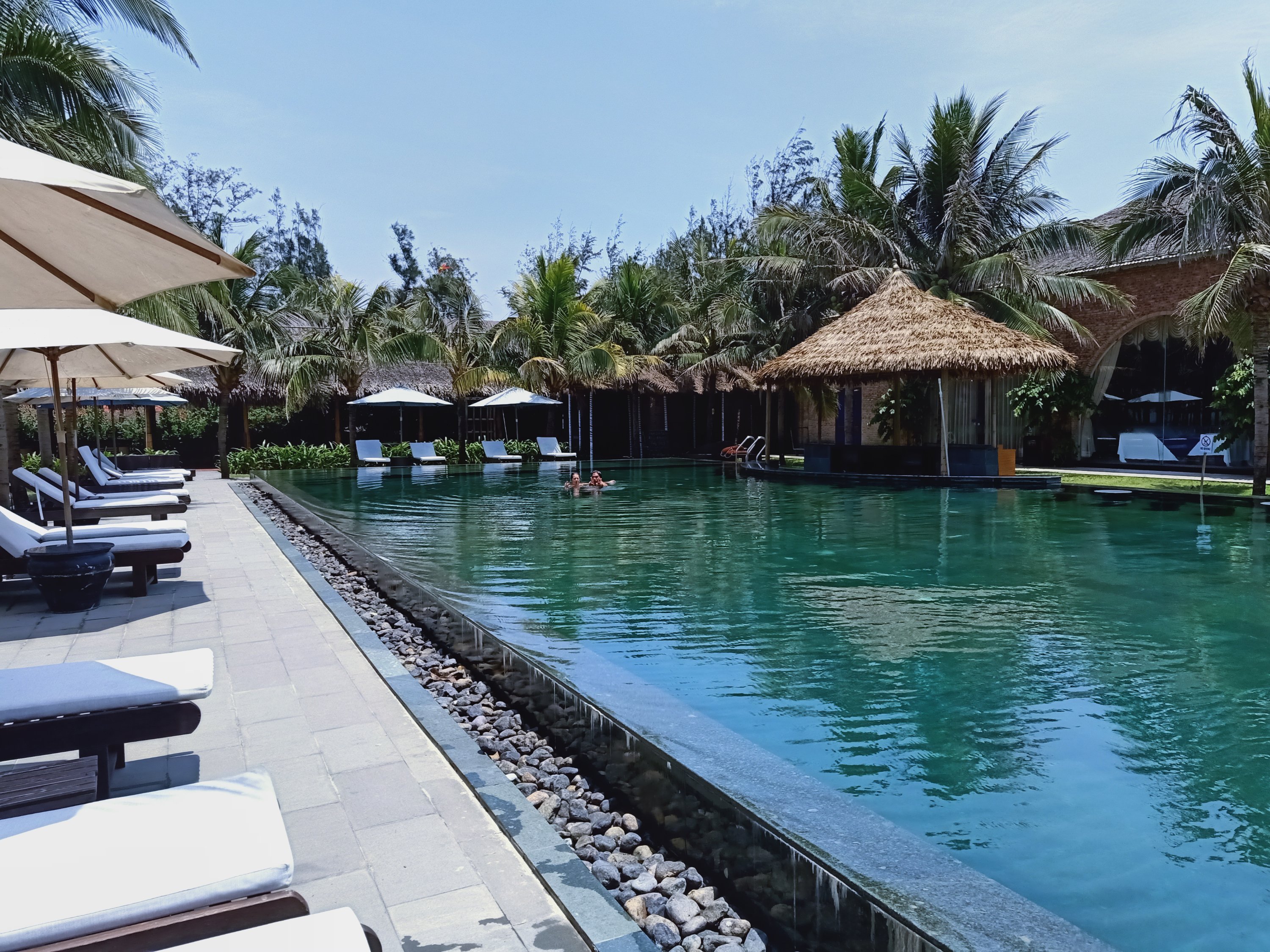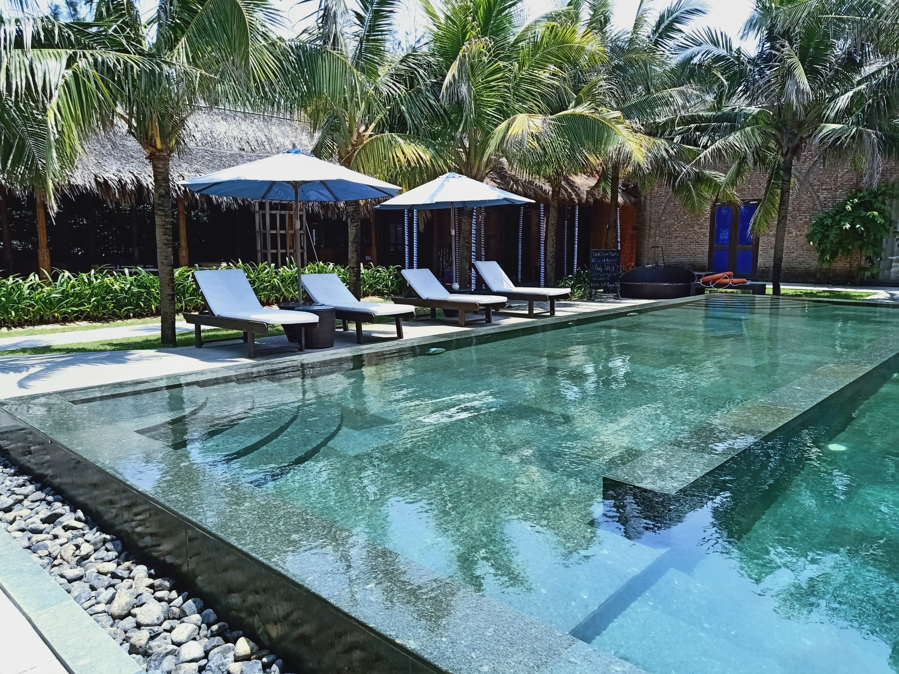 I’d arranged for us to meet Caroline (who used to live in Phong Nha) at 9 Grains Bakery & Cafe in Hoi An, at 9.30am. She is now one of the 2 owners of it and they do great croissants so we decided we would meet her there for a civilised catch up. With our croissants I had a lovely pot of earl grey tea and Captain Caveman had a couple of espressos made with the freshly delivered Faifo Roastery coffee. The cafe soon filled up with expat families and Vietnamese groups and the AC was nice and cool. By about 11am Caroline had suggested we go to the beach but she needed to change, so we would go to her place, just around the corner. As we left, she gave me a bar of handmade coconut soap, which they make and sell in the cafe. My eczema had been playing up on my neck again so this would be good to use. Captain Caveman walked it, while I had a lift on Caroline’s Royal Enfield Himalayan motorbike.