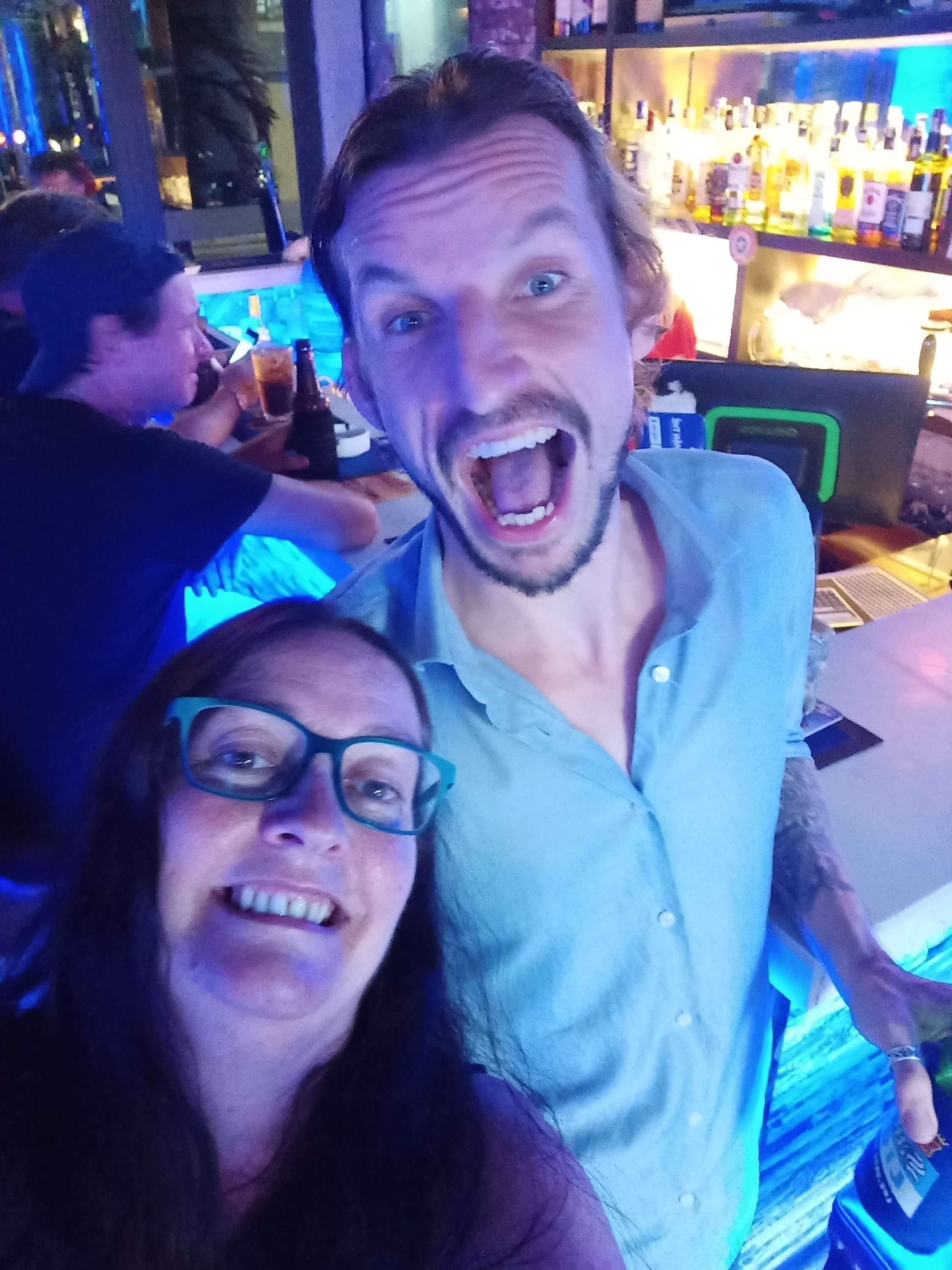 By 6pm Caroline had friends, Jake and Hawk, turn up and was almost setting fire to her own tea towel, while making more popcorn. I thought I’d met Jake before, he seemed familiar, but he said not. He then had to leave because he’d lost his wallet and his phone. Hawk, who we knew already, is a fitness instructor so didn’t have an alcoholic drink. Caroline can be a bit of a booze bully, a quality I like in a mate, so I continued on the white wine while her and Captain Caveman went on to beers. I took over making popcorn and I definitely shouldn’t have because Caroline had burned the pan already on the last lot and I almost set the towel on fire again. We were meant to be elsewhere at 5pm but at 6pm I was taking photos, still at Caroline’s place. I thought we left earlier but my camera said we were still there at 7.15pm so I think we may have upset Captain Caveman’s friends. We got a taxi and things were a bit hazy as to what happened for the next hour. I had wrongly assumed we had been back to the hotel to change to go out, but we didn’t.