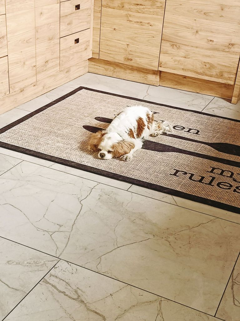 By the time I was walking past my parents’ and to Jamie’s, the sun was out and I hurried back to take Norman out for a walk. I found him laying on the kitchen rug, basking in the sunshine. On the walk, the skies got gloomier and by the end of it, little Norman had quite a spurt on to get home before he got wet.