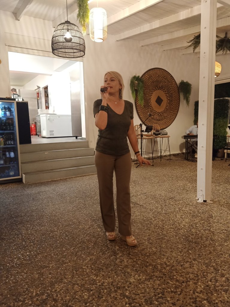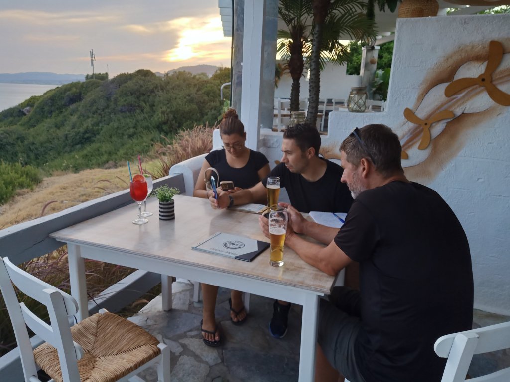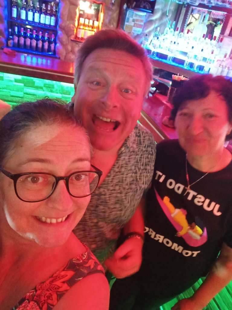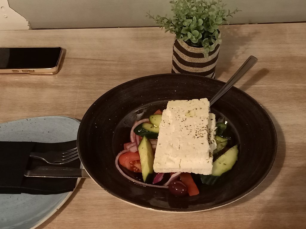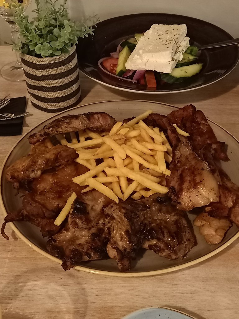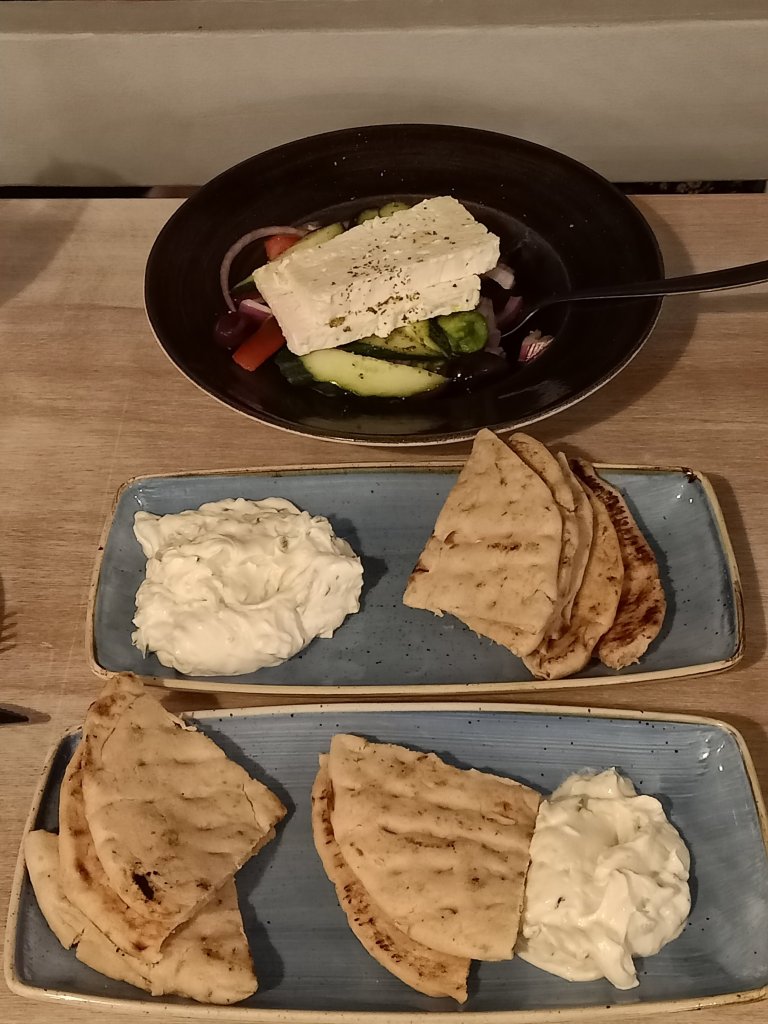 That evening, we got the bus to Flyers in Pefkos so there was no dinner to be cooked. At 5.30pm, after pet feeding, we walked to Yamas Bar for a cheeky drink while we waited for the bus. Captain Caveman had a beer, I had a Miloklefti cider and then the bus came and we had to make a run for it. The bus was €1.80 (£1.56) each for the one way trip and we planned to get a taxi back later. As luck would have it, it was happy hour at Dapapa Bar so we popped in to see Hannah and have a pre-dinner drink. Captain Caveman had an espresso martini and I had a pornstar martini for €11 (£9.54) in total. They were very nice and it was good to say hello and ‘Happy Birthday’ to Hannah, who was celebrating with a party later.