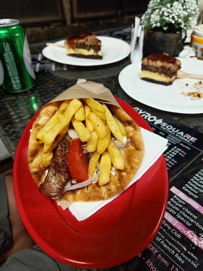 At 6pm, Michelle drove the 4 of us up to Pefkos for a drink at Flyers restaurant. Michelle and Captain Caveman had the Espresso Martini, Steve and I had a pint of lager. The views were lovely and we had a chat with the owner. Captain Caveman and I were booked in for the Greek Night on Friday and we were looking forward to it. Back in Lardos, we dropped the car off, then wandered round to GyroSquare The Grill Stories where we ate our dinner, accompanied with some chocolate birthday cake for one of the staff. The food was very tasty and I enjoyed it but I struggled to finish it all. That night, Steve and Michelle gave up their bedroom for Captain Caveman and I, they slept on their sofa bed so that they could leave for their flight that evening. They were off on holiday and would be back on the evening of the 17th.