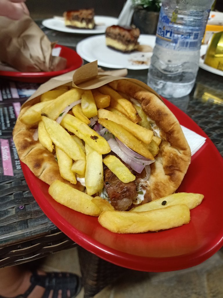 We’d gone to bed at gone midnight, Steve and Michelle were back in their bedroom and I was on the comfy sofa bed in the living room. At 2.30am on Monday 18th September Bob, the cat, decided he was going to start climbing all over me, then he sat on me and just stared. I did eventually get back to sleep but then I was awake once everyone else stirred. We all worked that day and, while Steve and Michelle went to the bakery for their lunch sandwiches, I had hummus, pitta and Baba Ghanoush at home. We finished work before 6pm then Michelle drove the 3 of us to Flyers in Pefkos. I was also tagging along on the big shop near Faliraki, about an hour away in the car. I decided to use the cash machine to get out some euros so that I could buy some provisions and maybe some pork products to take back to Dalyan. Unfortunately, I didn’t realise until later, but the machine kept my card – great! We did the big shop, I spent €17.44 (£15.29) on cheese, salami, gluten free pork sausages and coconut milk powder while my hosts bought a massive trolley full of stuff, including lots of pet food. On the drive back we stopped at Gyros & Burgers in Afandou. Steve had a burger, Michelle and I had the Pork gyros and all the food was super tasty and they have ultra clean and well decorated toilets.