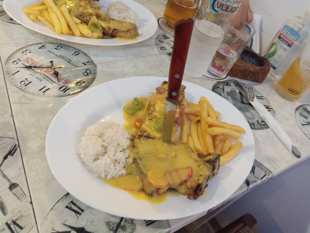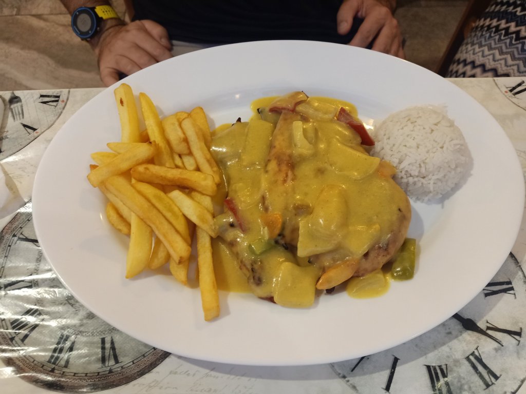 That evening we went to Lindos to meet a friend of Steve and Michelle’s and they introduced me to one of their favourite eateries, Mario’s. They were so enthusiastic about the Thai style curry sauce that all 3 of them ordered it with their pork or chicken. Being a bit fussy with my food, I couldn’t bring myself round to ordering the two together so I settled for just a pork chop with chips and salad. When the food came I had a dip of the sauce and it was incredible. I then had to order an extra portion of curry sauce as it was just so good.