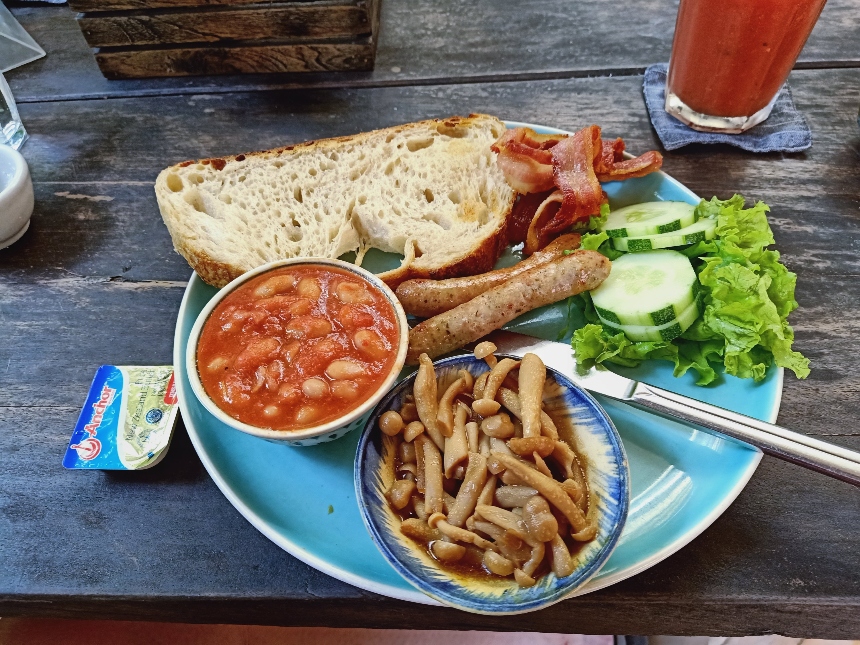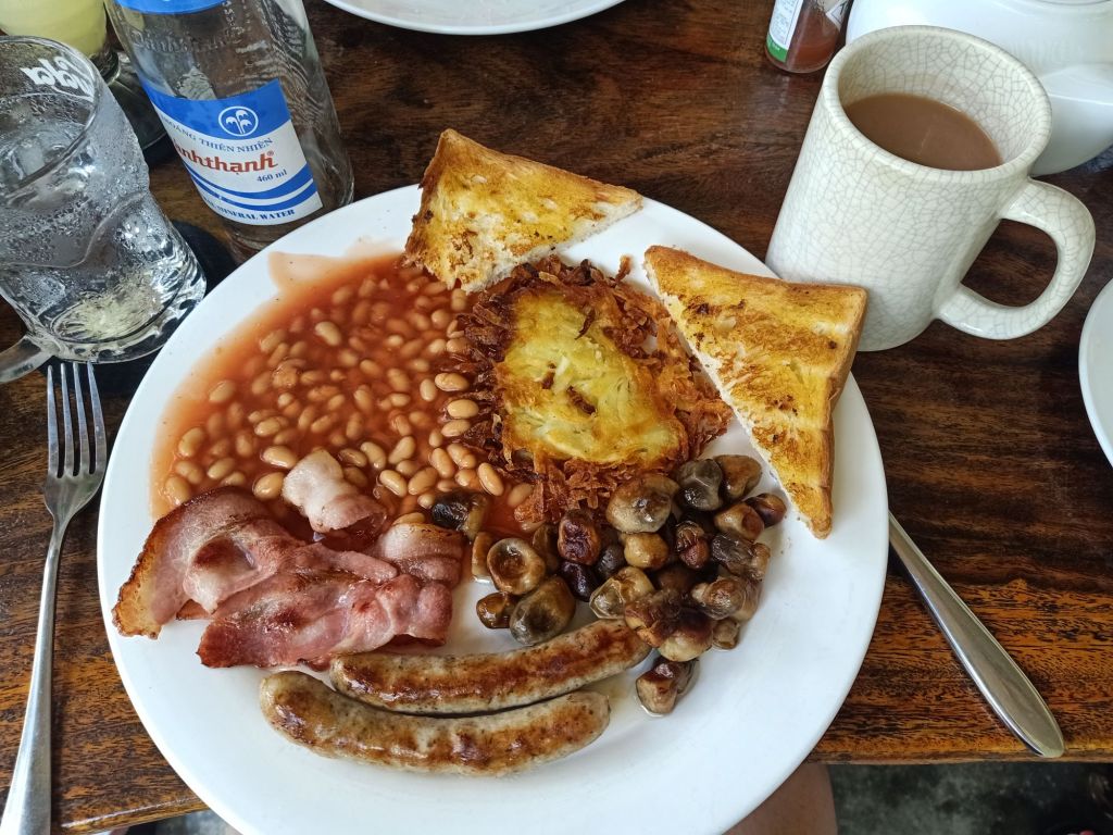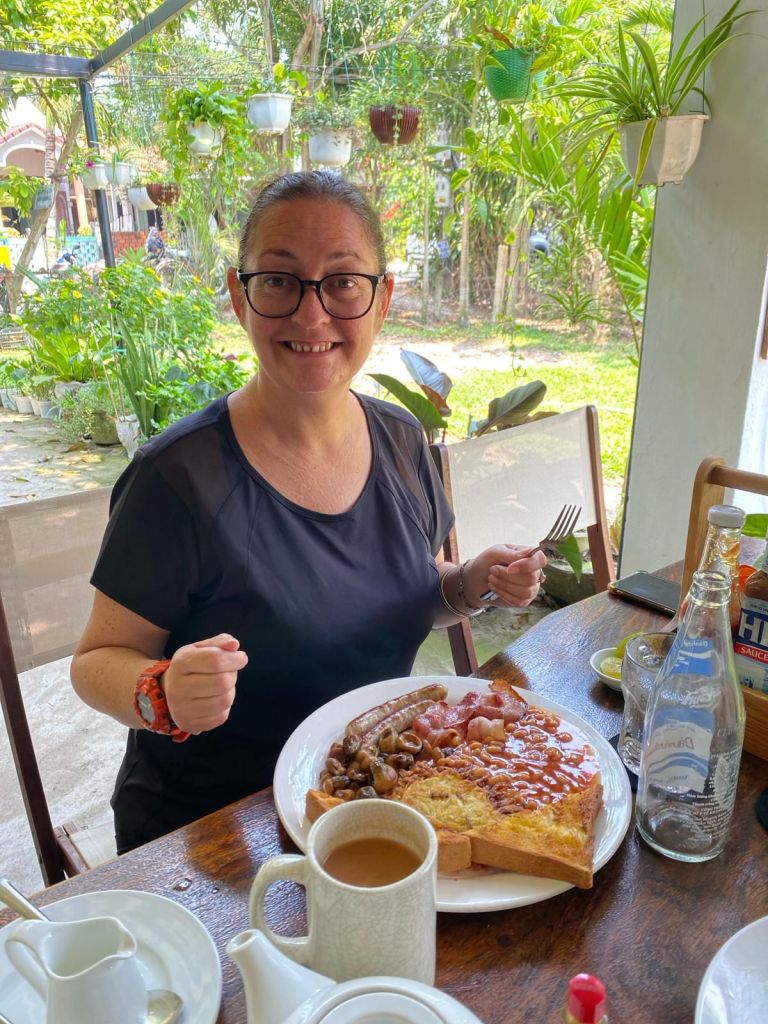 In the absence of scales I got up and fished out my trusty tape measure on Wednesday 27th March. Today would be the 3rd Dalyan (Not so) Fat Club I’d not attended, since being in Vietnam. I was missing it but we had a group chat on Messenger that was keeping me going with support from other members and Carol. My pee was the colour of treacle and I was severely dehydrated after yesterday’s overly long journey and the amount of wine I’d had last night. This week my total syn consumption was 352, more than 3 times my allowance, and 197 of those syns were on alcohol. So, I was very surprised with my results this week; Bust no change and still 1cm under target, Waist -2cm and back at target, Hips -1cm and back at target. It was a miracle but I was already aware this could catch up with me next week! Captain Caveman topped up my SIM card from Phong Nha but I didn’t know how to get a phone package on so Caroline booked me her Grab driver to come get me. She also met me outside the hotel and we then changed plans. She gave my bag to the driver and asked him to put it in her apartment, he had a key. Then I got on the back of her scooter and we went to 9 Grains Bakery, which she co-owns. Once there, I was treated to a pot of earl grey tea and an amazing pain au chocolat for breakfast. While there, the Grab driver sent a photo of my bag in her house which was so nice. I met Le, Caroline’s business partner, who helped me put a package on my phone. We also met up with Hawk, a fitness guru and motorbike tour guide from the Uk. He and I met years ago through Captain Caveman, we get on well and he’s now one of Caroline’s best mates. It was good to see him and have a bit of English banter. At 11.30am I also got a great cheese, lettuce and onion sandwich on sourdough and a peppermint tea for an early lunch.