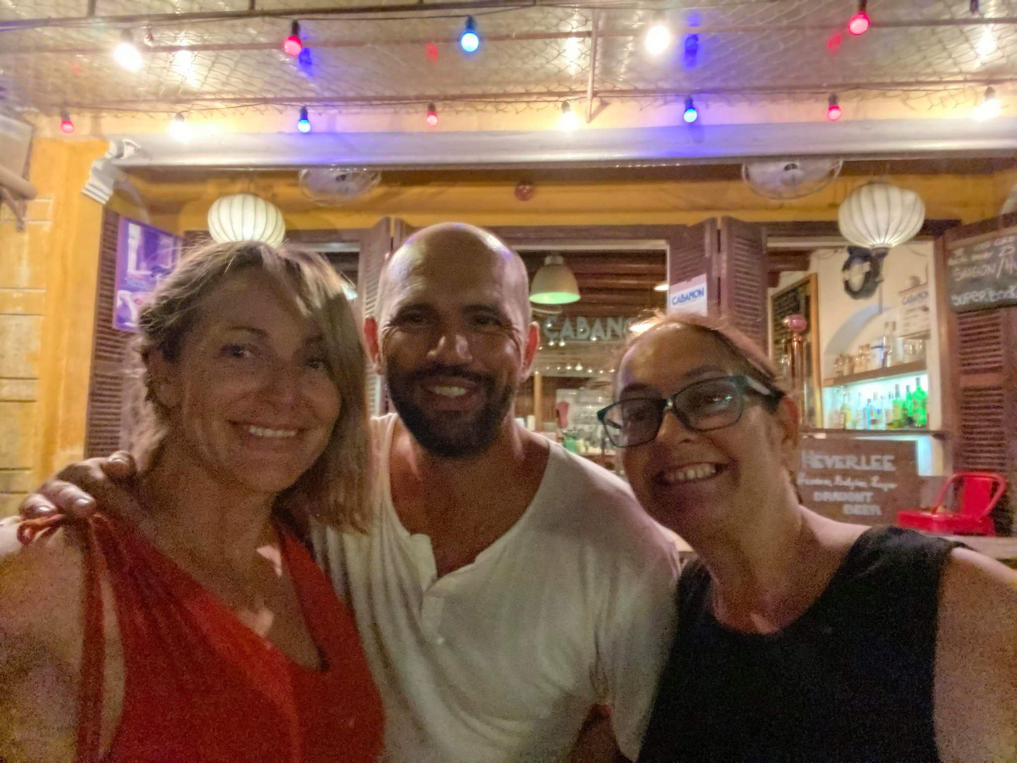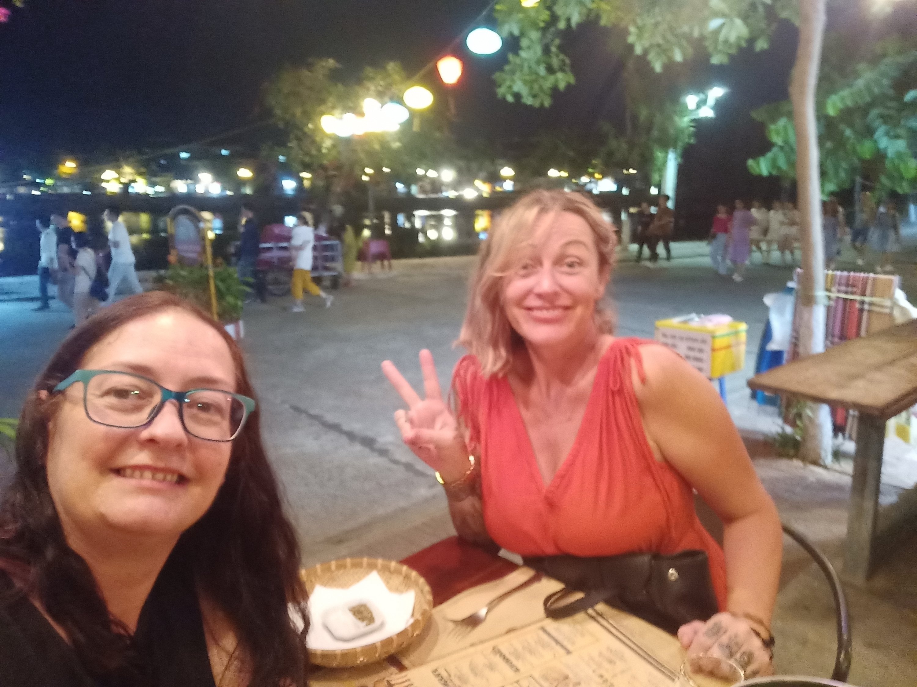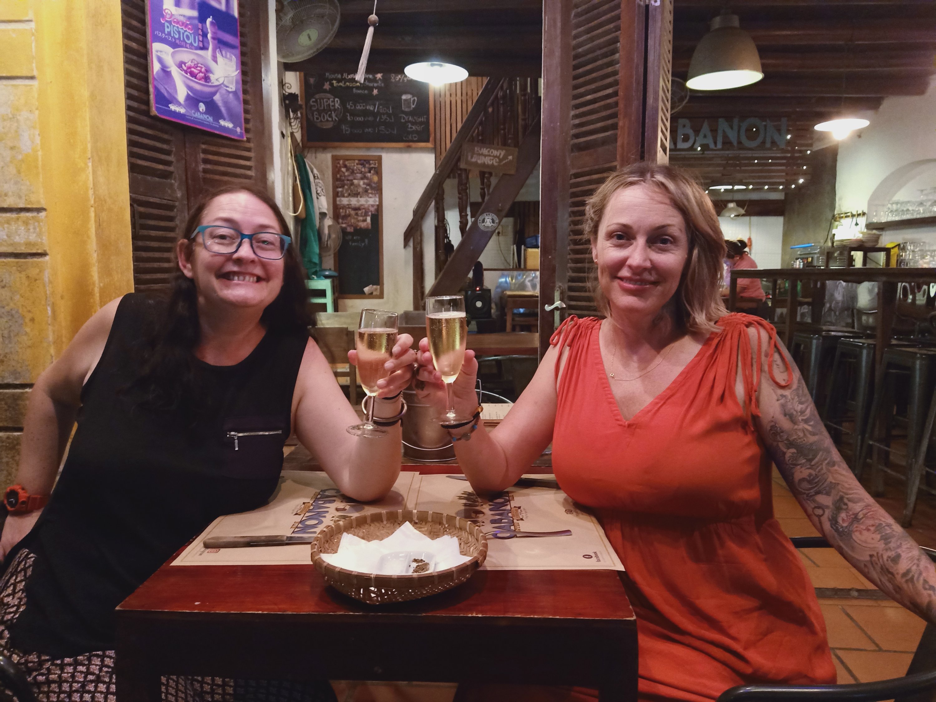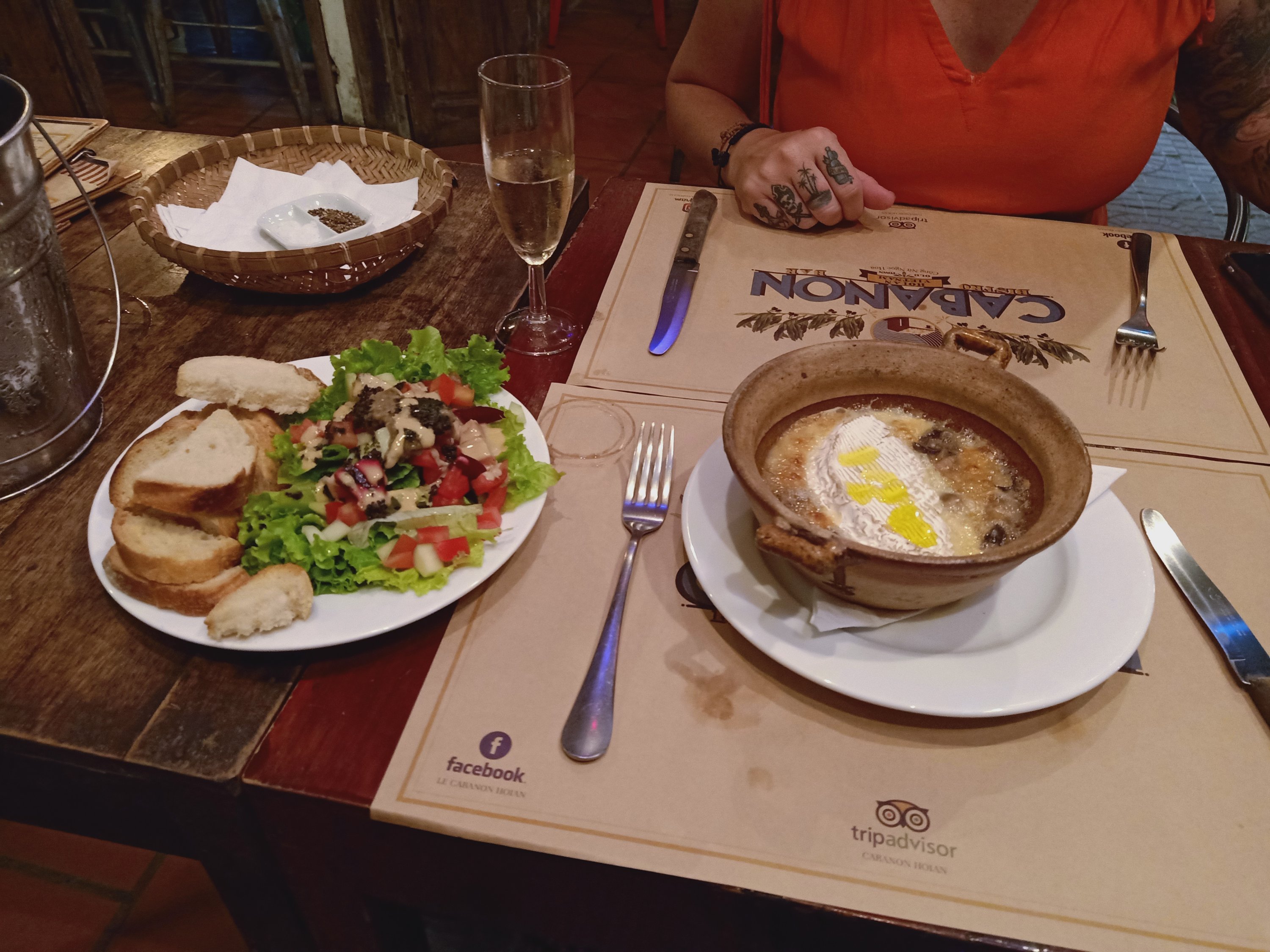 Caroline had been invited to a friend’s house party for sunset, my stomach wasn’t great after the sausages so I had a little nap and then gave belly rubs to River. Around 7.30pm Caroline came home and we decided to get a taxi to the old town for dinner. I was shocked at how quiet it was as we walked from the main street towards the river front, something I couldn’t have done last time I was here. Caroline suggested we eat at a delightful little place called Cabanon where she introduced me to the chef and owner, Gilles. We decided to have a bottle of fizz and a half baked camembert to share for starters, Caroline also ordered the pâté which I don’t normally eat. We were quite hungry because we had not eaten since breakfast and I’d taken a Gastropulgite prior to dinner to help prevent any stomach problems. The starters were fantastic and I even tried, and enjoyed, some of the pâté. For mains we decided to share our dishes of carbonara and chicken cordon bleu and the food was so good! A man on the next table heard Caroline talk about her forthcoming motorbike ride and went off to buy her a bandana for wearing underneath her helmet to keep her hair good and prevent a sweaty head – how nice of him! Back home we had a nightcap, of more fizz, while singing and dancing to music – I’d had a great time on my last night in Hoi An.