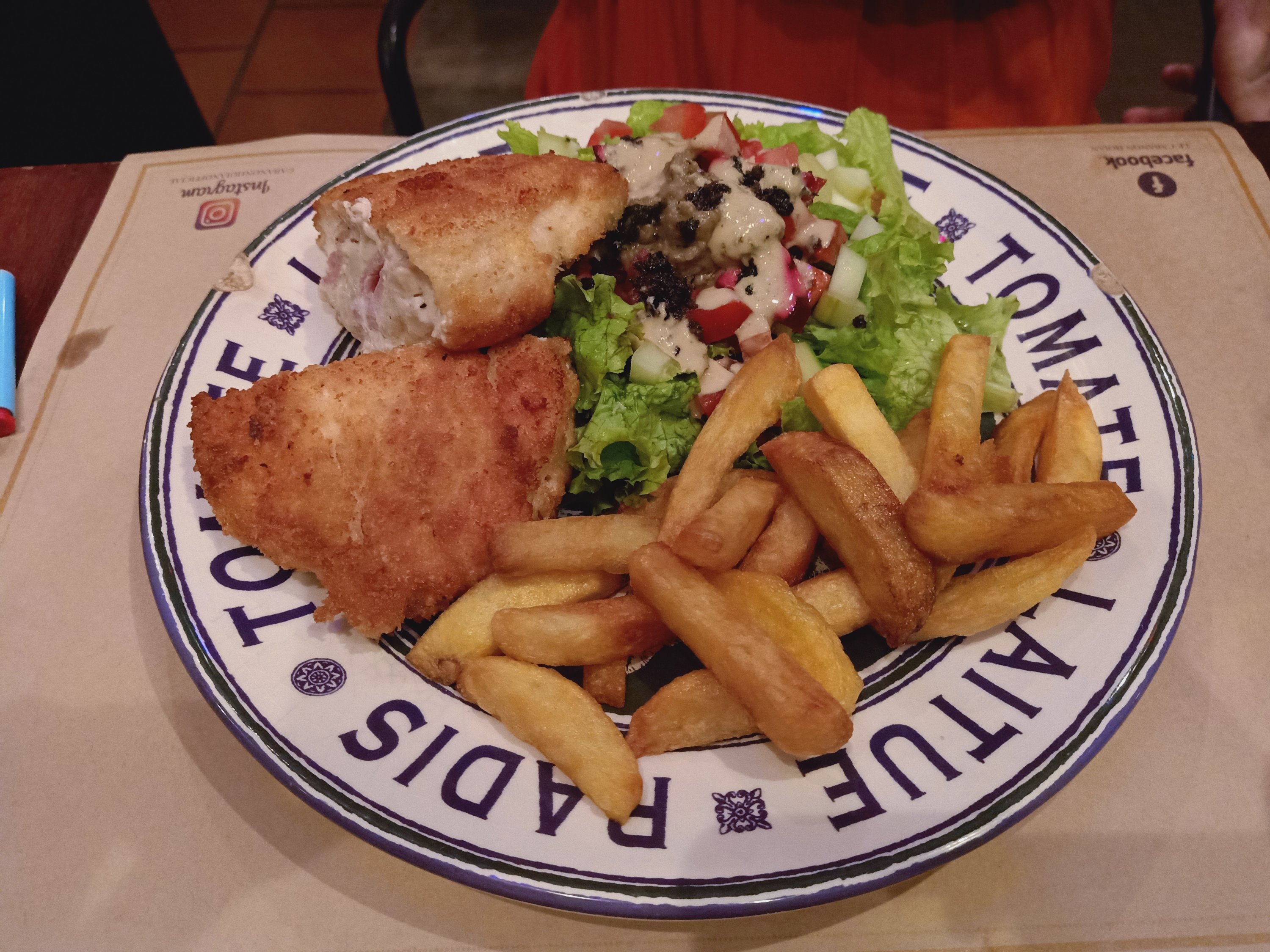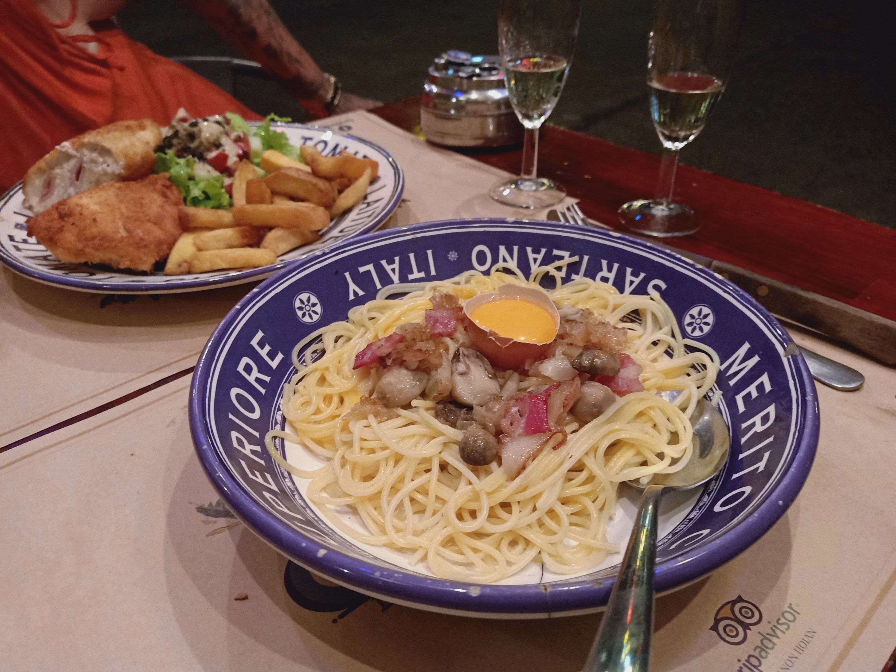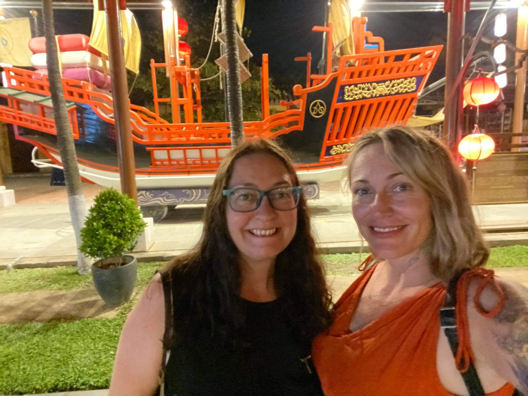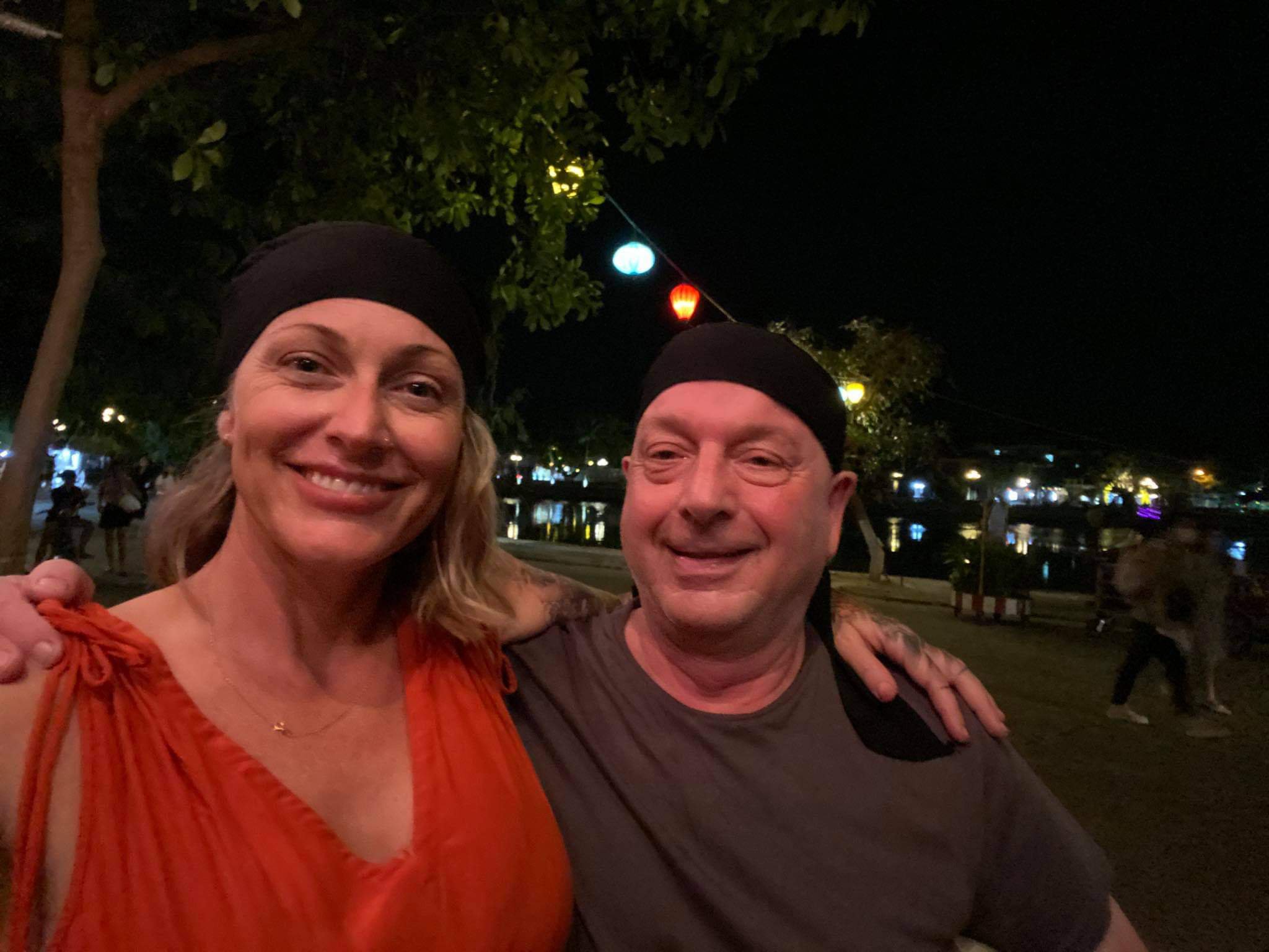 Caroline had been invited to a friend’s house party for sunset, my stomach wasn’t great after the sausages so I had a little nap and then gave belly rubs to River. Around 7.30pm Caroline came home and we decided to get a taxi to the old town for dinner. I was shocked at how quiet it was as we walked from the main street towards the river front, something I couldn’t have done last time I was here. Caroline suggested we eat at a delightful little place called Cabanon where she introduced me to the chef and owner, Gilles. We decided to have a bottle of fizz and a half baked camembert to share for starters, Caroline also ordered the pâté which I don’t normally eat. We were quite hungry because we had not eaten since breakfast and I’d taken a Gastropulgite prior to dinner to help prevent any stomach problems. The starters were fantastic and I even tried, and enjoyed, some of the pâté. For mains we decided to share our dishes of carbonara and chicken cordon bleu and the food was so good! A man on the next table heard Caroline talk about her forthcoming motorbike ride and went off to buy her a bandana for wearing underneath her helmet to keep her hair good and prevent a sweaty head – how nice of him! Back home we had a nightcap, of more fizz, while singing and dancing to music – I’d had a great time on my last night in Hoi An.