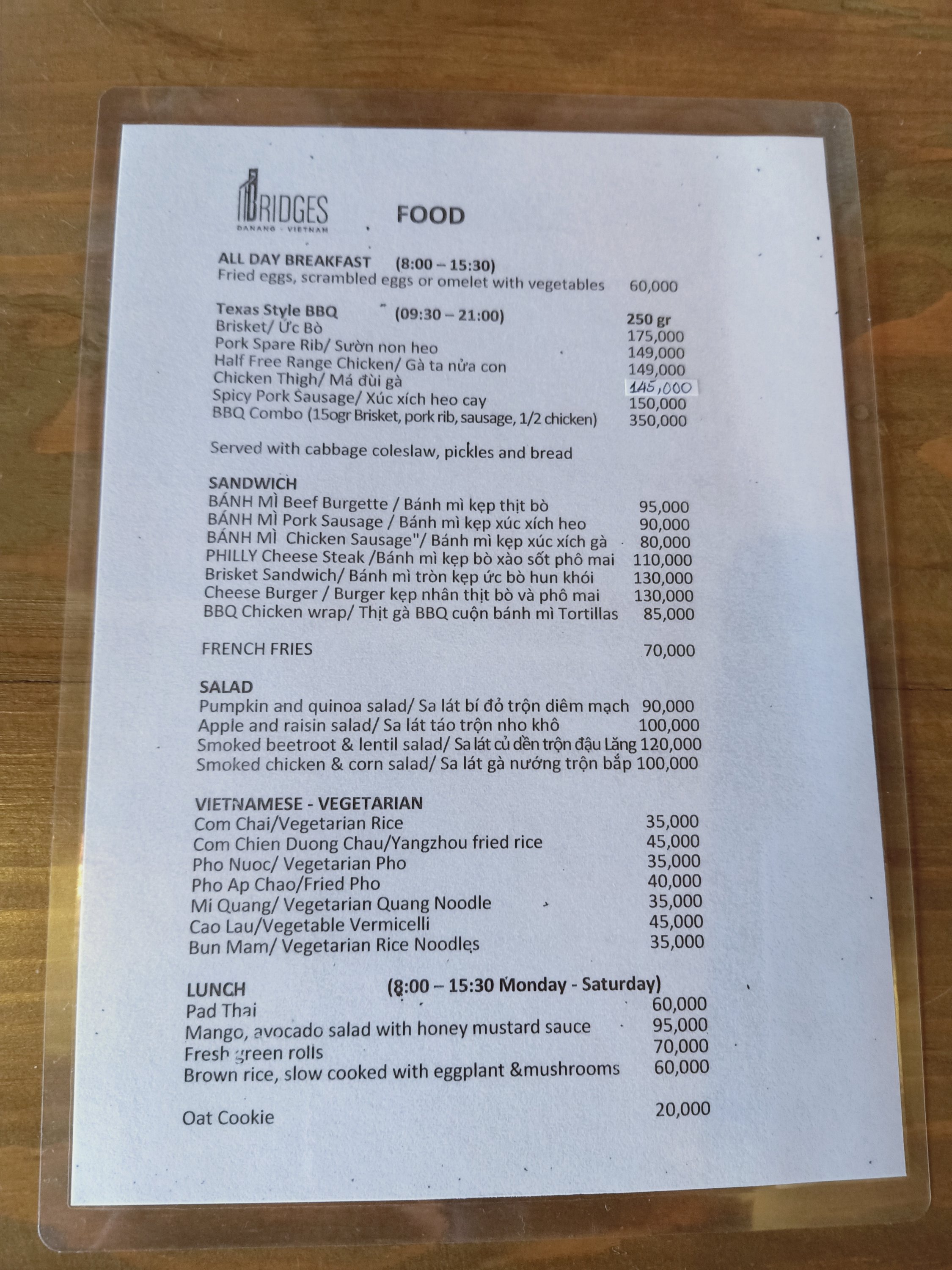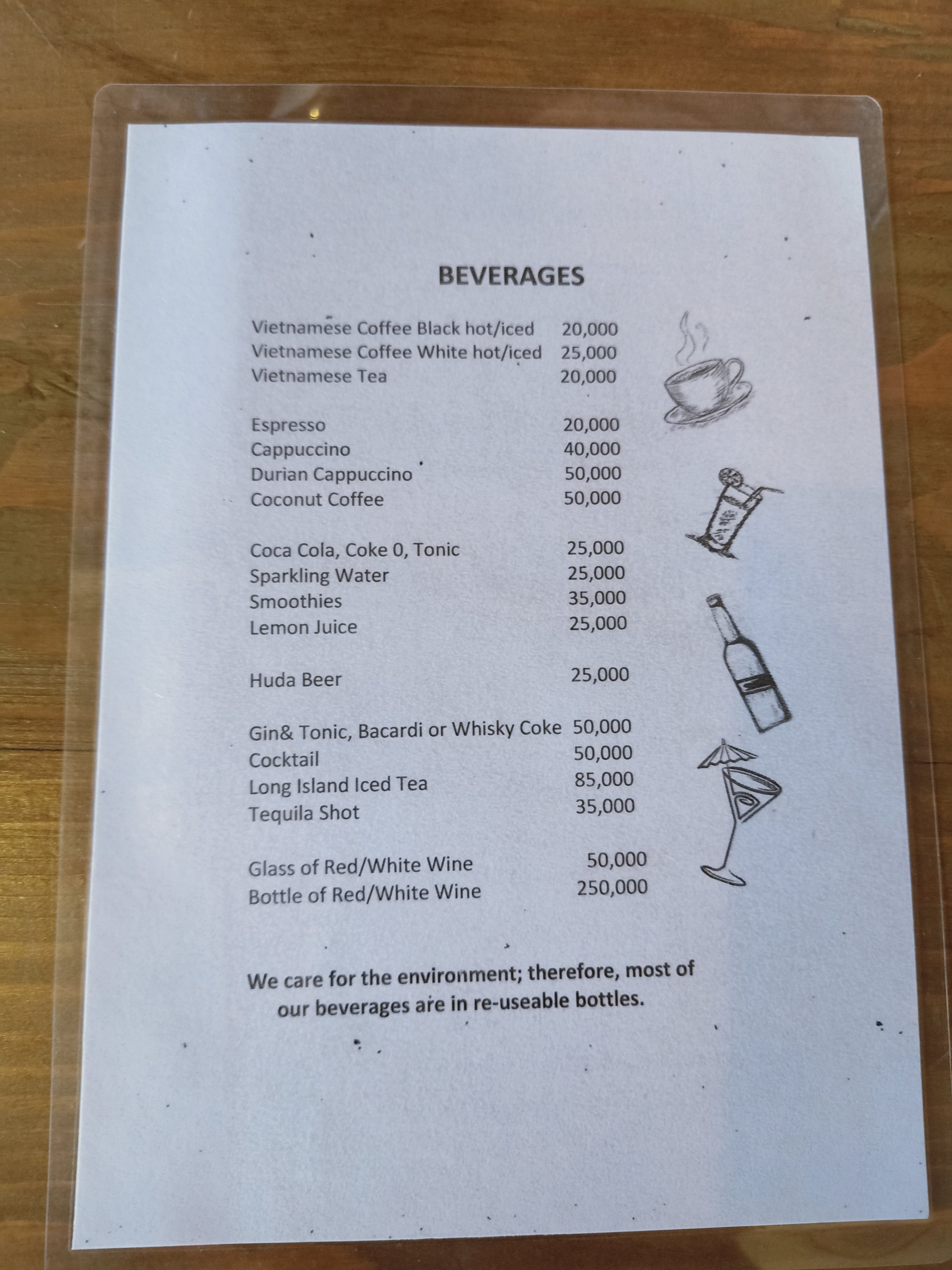 Our bill was as follows: Camembert 360,000 Pizza 170,000 2 bottles of wine 1,360,000 Total spent 1,890,000vnd (£60.48)