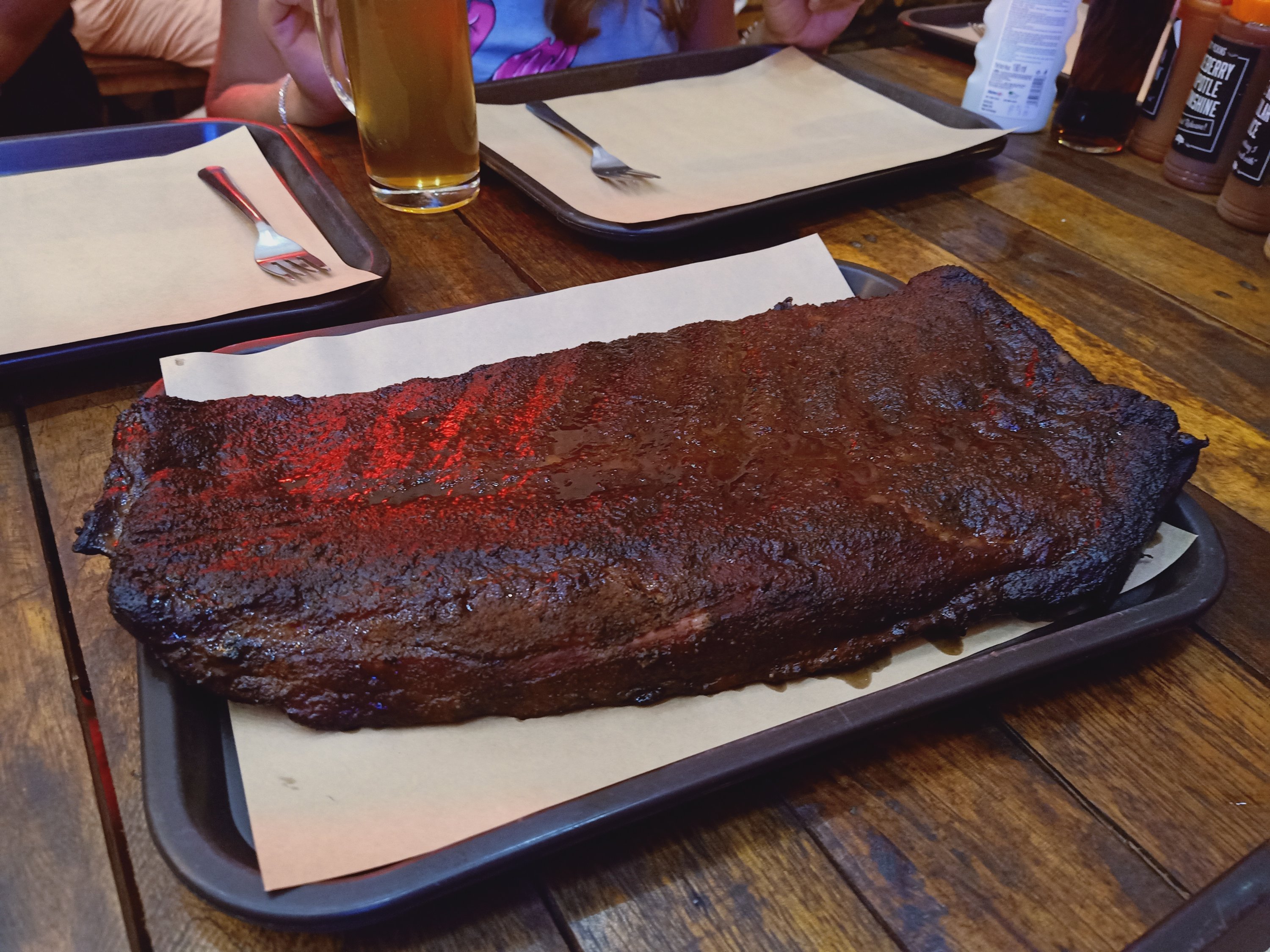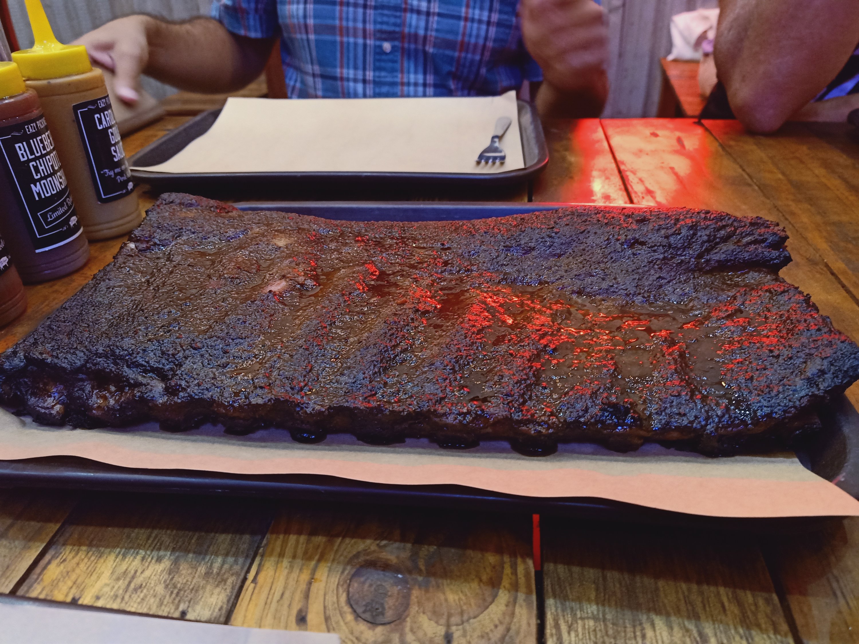 That afternoon I had another important appointment at the opticians as I had noticed my eyesight was getting worse for distance and my glasses were very worn out. At the opticians they were very thorough and I had good news, my eyes were now both the same prescription (-3.25) and I chose some new glasses, this time I went darker. Unfortunately they would have to post them to me as they wouldn’t be ready before we went back home, but that was fine. Back at the hotel we got ready and were off to a small BBQ restaurant which Captain Caveman and I had tried and failed to go to before. They only open at weekends and do a limited amount of food which when it’s gone, it’s gone. Hamish had organised it well and we had a big table at Eazy Pickins where I joined him, Ania, Mik, Darran, Kendra, Bryan, and a couple I’d not met before. The food was unbelievably good and we all forced as much down as possible before going for one more drink at Oi Bar. I had a couple of glasses of wine and Hamish got everyone a shot but got told off because we were all too full for shots. It was a great night but Hamish, Ania and I left the others at Oi bar and went back to the hotel. I didn’t want to be hungover when Captain Caveman arrived at stupid o’clock in the morning and my ankle was a bit swelled up from a lot of walking today.