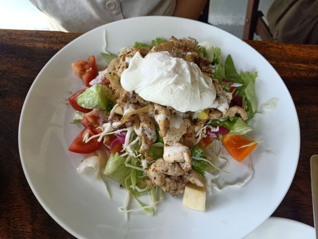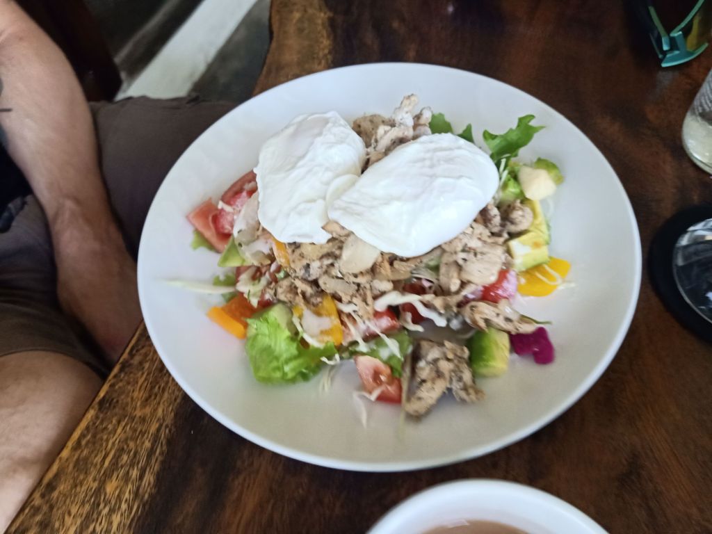 After drinking 2 cold beers, which I’d got from the shop next door for 11,818vnd (38p) each and waiting for the washing to finish, Captain Caveman and I decided to visit an old favourite restaurant. The Nomad Kitchen, which was within walking distance from our hotel, had changed premises and no longer had AC. It did have a roof top with a bit of breeze and some fans so we went up there. We each ordered a glass of wine, I fancied the chicken salad as I had bikinis to look good in, Captain Caveman ordered pasta. The food was great, more wine was had (we should have ordered a bottle) and then his friend and former colleague came to meet us. Katie, her husband Sasha and her little baby, Sam, are really lovely and we spent a couple of hours with them chatting. We had a complimentary cheese cake, said hello to the owner and our friends shared a generous portion of fish and chips which looked great. I forgot to take a note of the bill as Captain Caveman paid online.