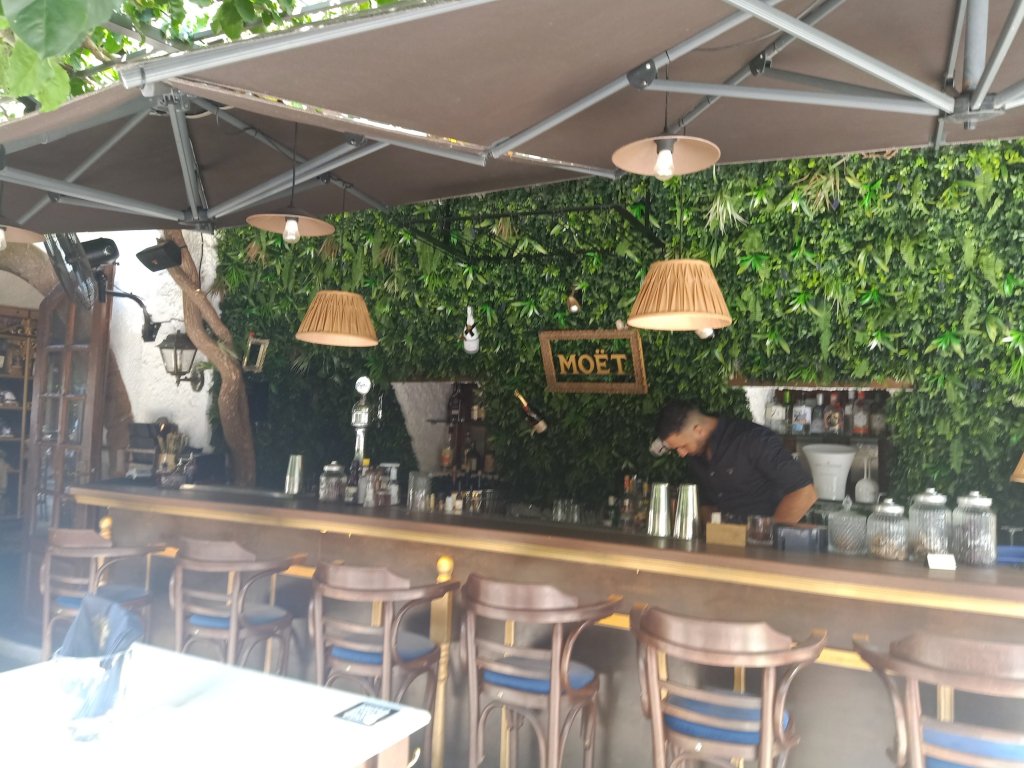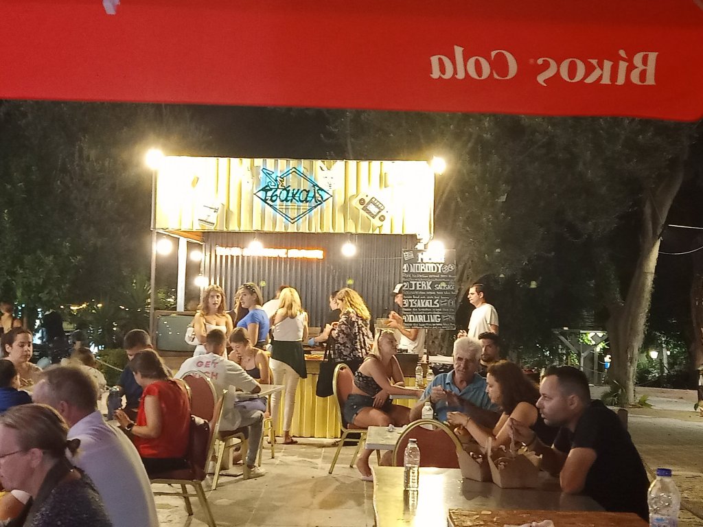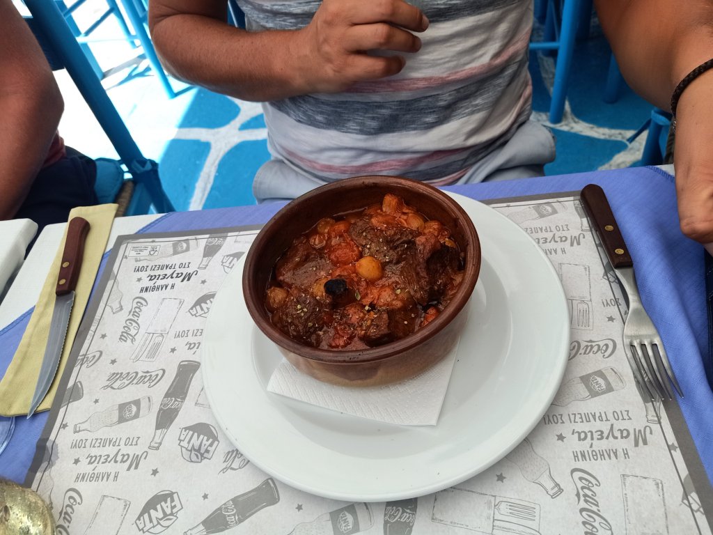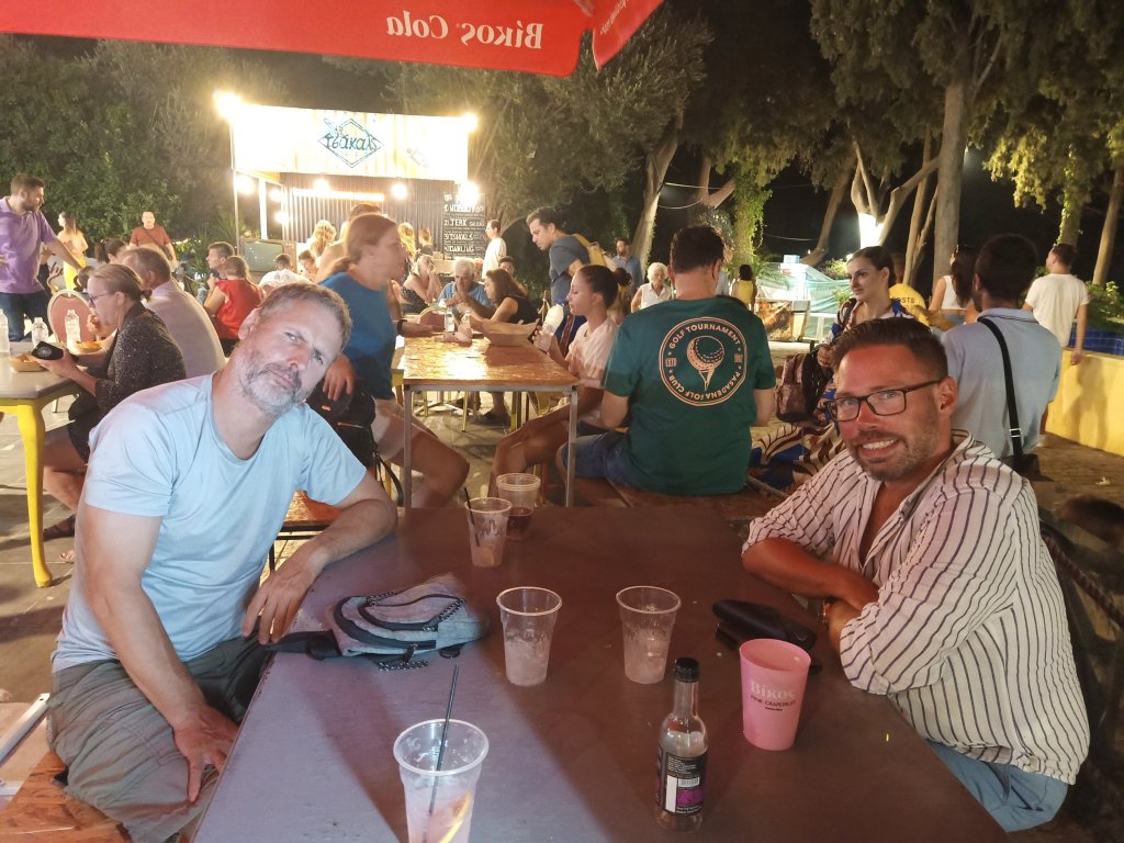On Thursday 6th July I was up early, busy with plant watering and animal duties then I worked 9am to 4.30pm. After feeding the cats, getting the hang of who’s indoor and outdoor, I decided a quick trip to the shop was a good idea. I spent €13.30 (£11.41) on Prosecco, crisps and chocolate at Big Family supermarket then decided to stop at a bar. I ordered a cheeky Milokleftis cider with ice at Yamas bar and sent a message to Louise to see if she had finished work. Shortly after, she arrived and ordered a coffee but another Milokleftis and a cocktail arrived. What was a quick drink after work with a new friend, turned in to quite an impromptu evening. After a few ciders I decided I couldn’t be bothered to go home to cook so suggested we eat out.
