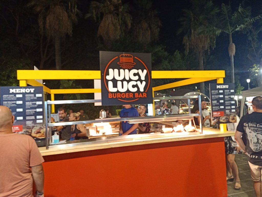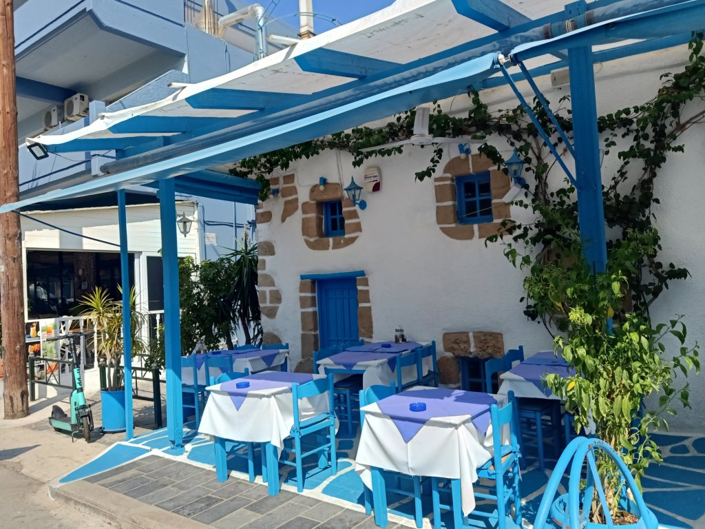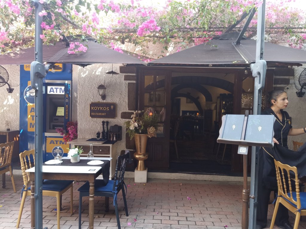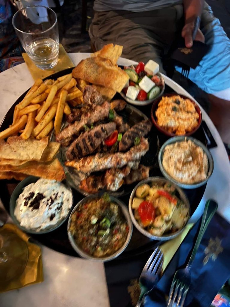 On Thursday 6th July I was up early, busy with plant watering and animal duties then I worked 9am to 4.30pm. After feeding the cats, getting the hang of who’s indoor and outdoor, I decided a quick trip to the shop was a good idea. I spent €13.30 (£11.41) on Prosecco, crisps and chocolate at Big Family supermarket then decided to stop at a bar. I ordered a cheeky Milokleftis cider with ice at Yamas bar and sent a message to Louise to see if she had finished work. Shortly after, she arrived and ordered a coffee but another Milokleftis and a cocktail arrived. What was a quick drink after work with a new friend, turned in to quite an impromptu evening. After a few ciders I decided I couldn’t be bothered to go home to cook so suggested we eat out.