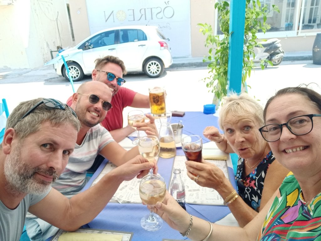We nipped back to the hotel after lunch but then met up again at a bar called Ottima. We were meeting Steve and Michelle to go to a festival that was on at Therme Park in Rhodes Town, nearer to Marks & Spencer’s. Steve and Michelle were really busy with work so they couldn’t stop long, just long enough to meet everyone and have a pint of ale from The Mule’s Brew pop up bar. After they left, the 5 of us stayed to listen to the singers, had another drink from the cocktail bar and it was a nice little event. We walked back to our hotels and called in to a lovely bar called Koykos on the way back, we sat outside and ordered wine and a sharing platter which was lovely and not expensive. Our night finished at Felini, an ice-cream place where Captain Caveman had his favourite, pistachio. I had a mixture of mango and raspberry sorbet – the diet was once again on hold!