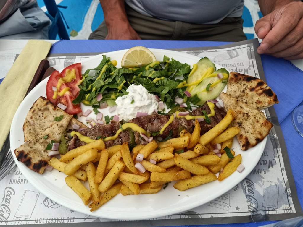 At 6pm, Michelle drove the 4 of us up to Pefkos for a drink at Flyers restaurant. Michelle and Captain Caveman had the Espresso Martini, Steve and I had a pint of lager. The views were lovely and we had a chat with the owner. Captain Caveman and I were booked in for the Greek Night on Friday and we were looking forward to it. Back in Lardos, we dropped the car off, then wandered round to GyroSquare The Grill Stories where we ate our dinner, accompanied with some chocolate birthday cake for one of the staff. The food was very tasty and I enjoyed it but I struggled to finish it all. That night, Steve and Michelle gave up their bedroom for Captain Caveman and I, they slept on their sofa bed so that they could leave for their flight that evening. They were off on holiday and would be back on the evening of the 17th.