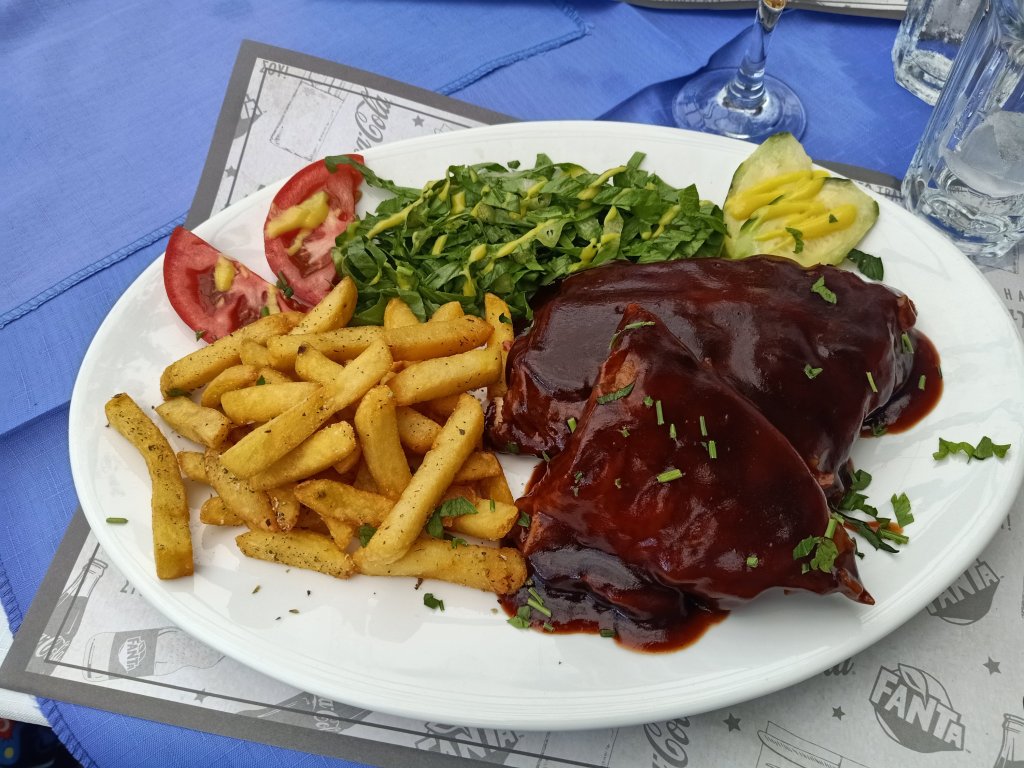 I was up for doing more work on Thursday 11th May, even though I don’t usually work on Thursdays. I was enjoying the flexibility of being able to work whatever hours or days suited too. In the morning I transferred some money to Rebecca, from Captain Boris boat trips, for the bottles of wine I’d bought. They were already delivered and my parents had got the other half of the stash, with Ma keeping a close eye on Pa not to drink it all too quickly. I knew that prices were set to continue to rise in Turkey, especially as the election date loomed, so I was happy to splash out now at what would probably be a cheaper price. For lunch I had fruit with greek yoghurt and honey because tonight Michelle had a girls night planned in Lardos, with dinner at one of my favourite restaurants. I worked in the afternoon, just for 4 hours, then I got ready for a meal at Valentina’s. I’d previously been with Captain Caveman and I remembered that the carafes of wine were particularly good value so I was looking forward to my second visit. Joining Michelle and I, were her friends Katy and Tracy. Tracy arrived after we had ordered so she didn’t eat but the rest of us shared some tasty cheese balls for starters. I just had to have pork (again) and went for the massive pork chop for main, Michelle had a steak and Katy had pasta. It was all delicious and the carafes of red wine went down well. The owner gave us a shared dessert of baklava and ice-cream as a treat, which was also delicious. The bill came to €30 each (£25.68) which I didn’t think was bad, for what we had – my pork took over an hour to eat because it was so big. After saying bye to Katy and Tracy, Michelle and I had a cheeky Milokleftis cider in Yamas bar on the way home. It had been a great night and I was sad that tomorrow was my last day (and night) in Rhodes. Captain Caveman was excited that I would be in Vietnam in a couple of days and had arranged to meet me in Saigon with the promise of a shopping trip for new clothes.