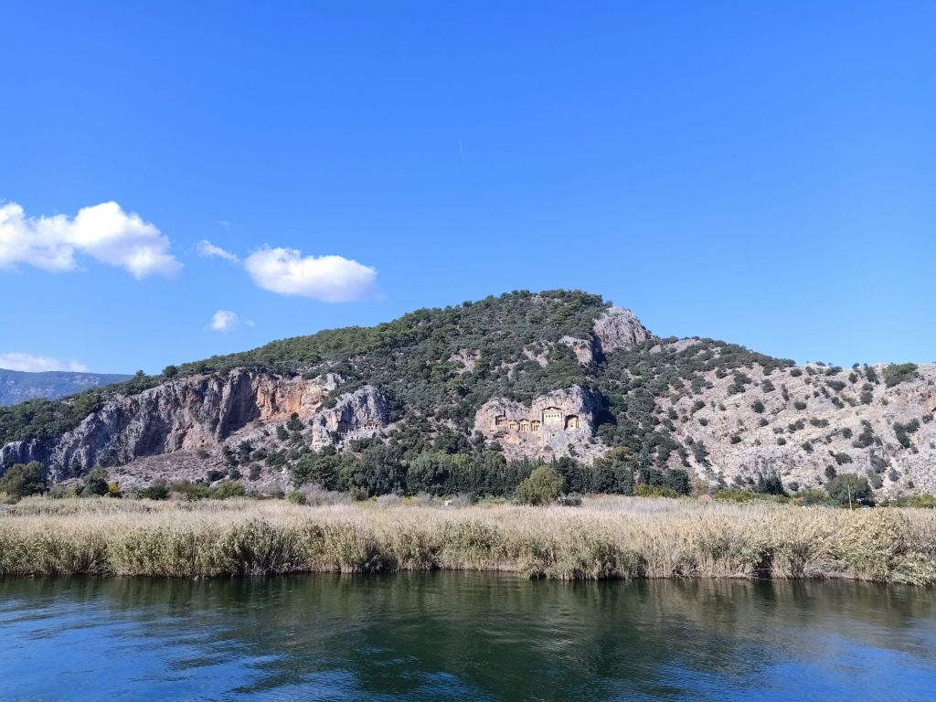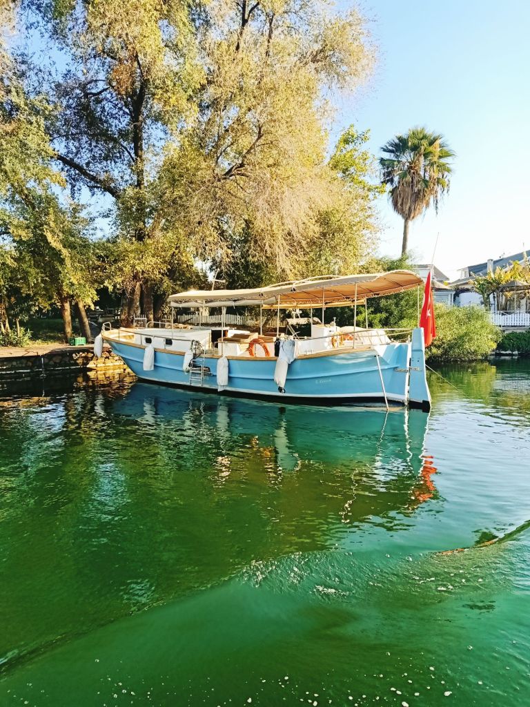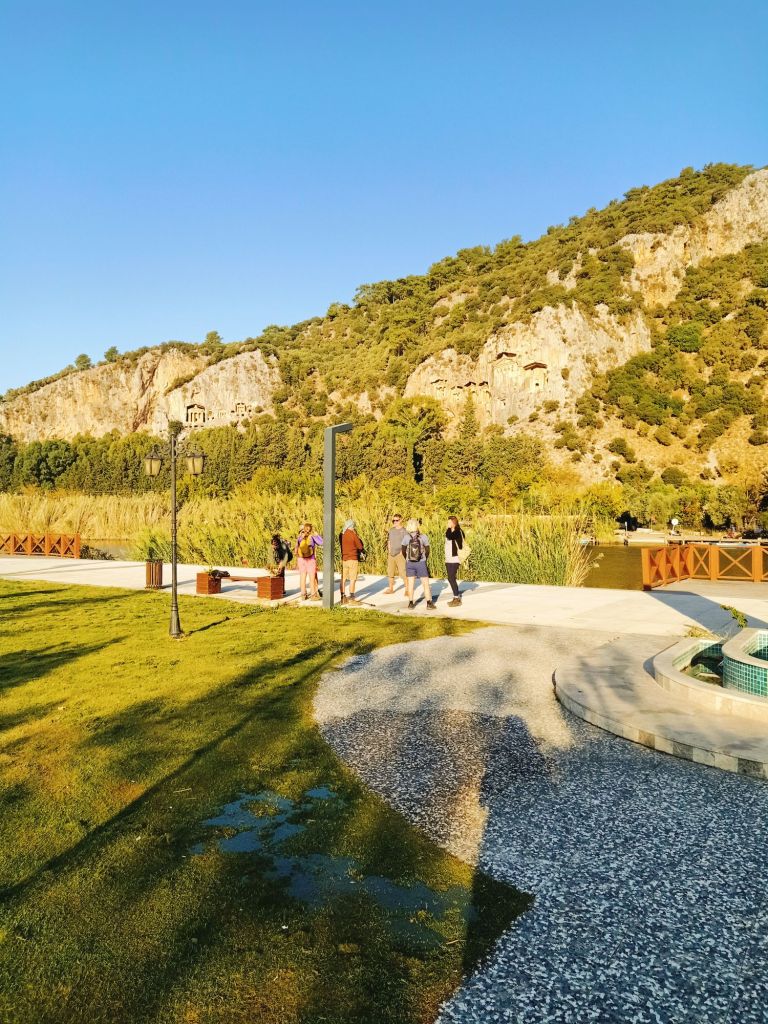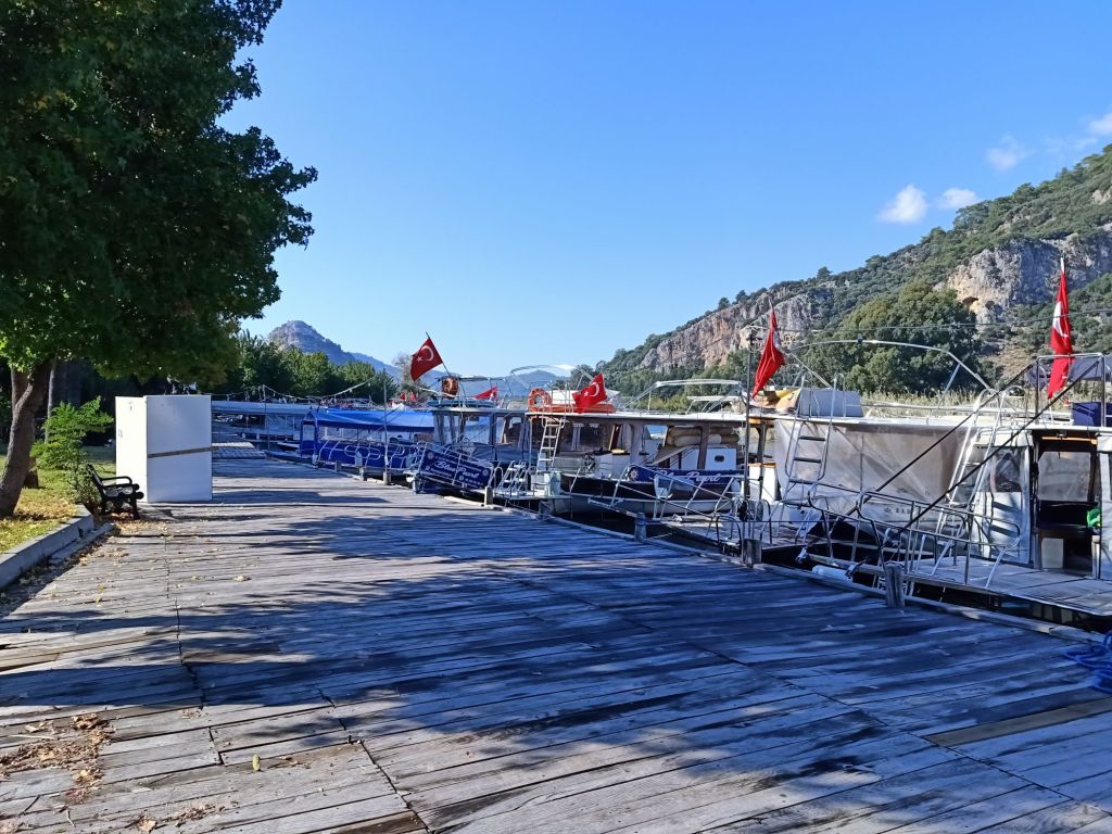 My parents were early but I was ready for our evening meal out. Ma had booked us in to Yalıcapkını (Kingfisher) Restaurant and she had arranged for the boat to pick us up at 6.30pm. We were about 15 minutes early so when we got on the boat, we decided to all have a wine. It wasn’t great and Mom’s glass of white was off and had to be replaced. It also wasn’t cheap at 300 lira (£5.56) for a glass – and we decided we wouldn’t bother with one on the way back. The boat trip was just for the 3 of us and we sailed over to the Kaunos Tombs for sunset. It was really beautiful and it took us less than half an hour to arrive at the restaurant’s jetty. I struggled to get off but was helped and it was still light as we walked through the gardens. One of the big differences I noticed from being in Antalya was that I’d not had to worry for the last 5 days about uneven floor surfaces, unless I had ventured on to the beach. Here in Dalyan, it’s a struggle to find an even floor surface anywhere.
